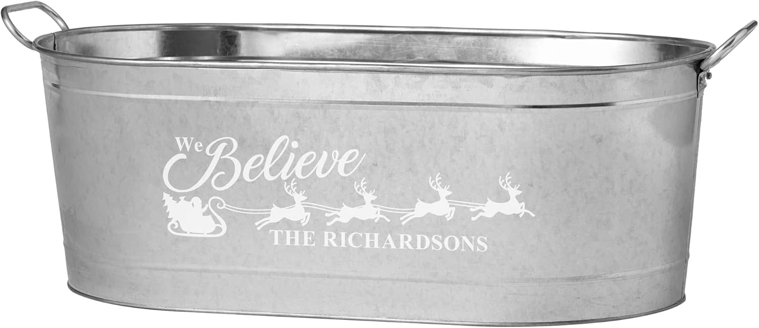 FILL 'ER UP: No Christmas party should be without this! Fill this custom galvanized drink tub with your favorite beverages and let the good times roll! "We Believe" always appears—along with Santa and 4 of his reindeer.
