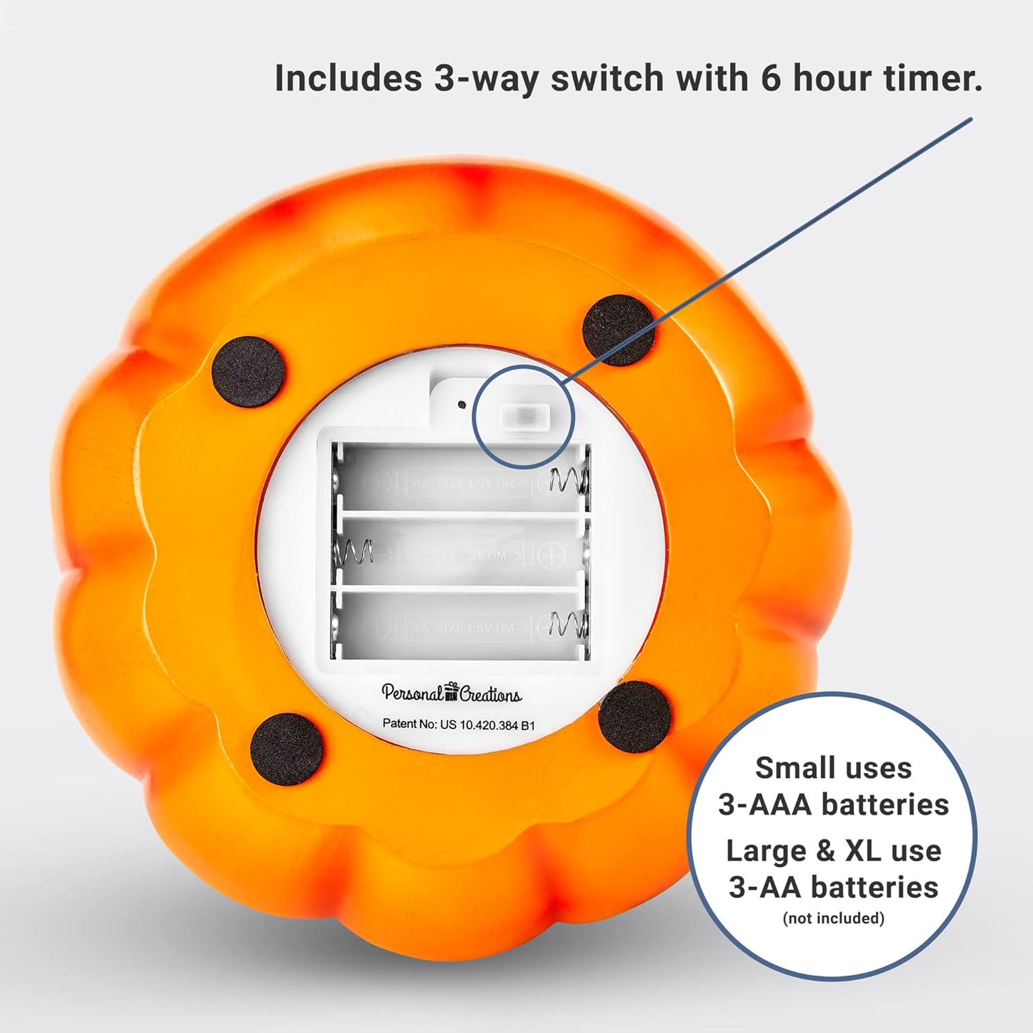 CONVENIENT TIMER: Extend battery life with a 3-way switch and 6-hour timer. Turn pumpkin on at dusk, then sleep soundly knowing it will automatically turn off. Uses 3 AA batteries (not included).
