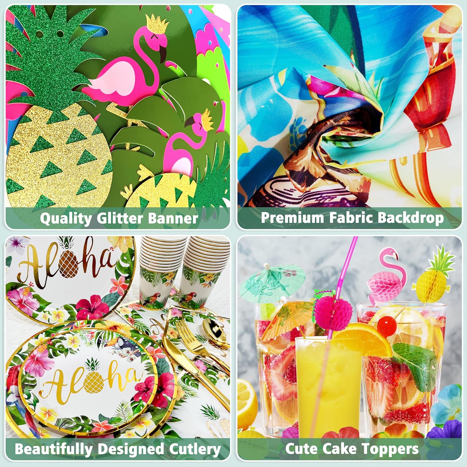 Luau Birthday Party Decorations 321Pcs Hawaiian Tropical Aloha Party Supplies for Summer Beach Holiday Disposable Dinnerware Set (24 Guest) Table Skirt Straws Backdrop Banner Balloon Garland Kit
