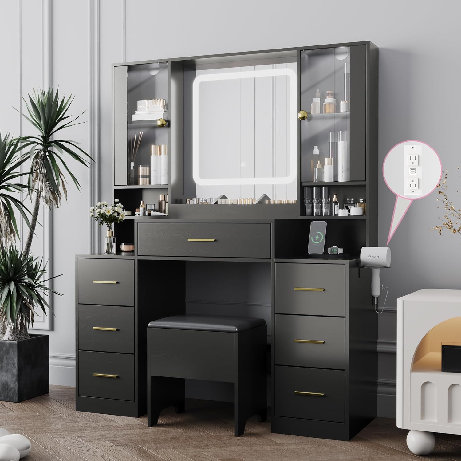Makeup Vanity with LED Light Strip Mirror and Chair, 7 Drawers & 2 RGB Cabinets Black Vanity Makeup Desk with Power Strip, Adjustable LED Lighting, and Cushioned Stool for Women, Girls, Teens