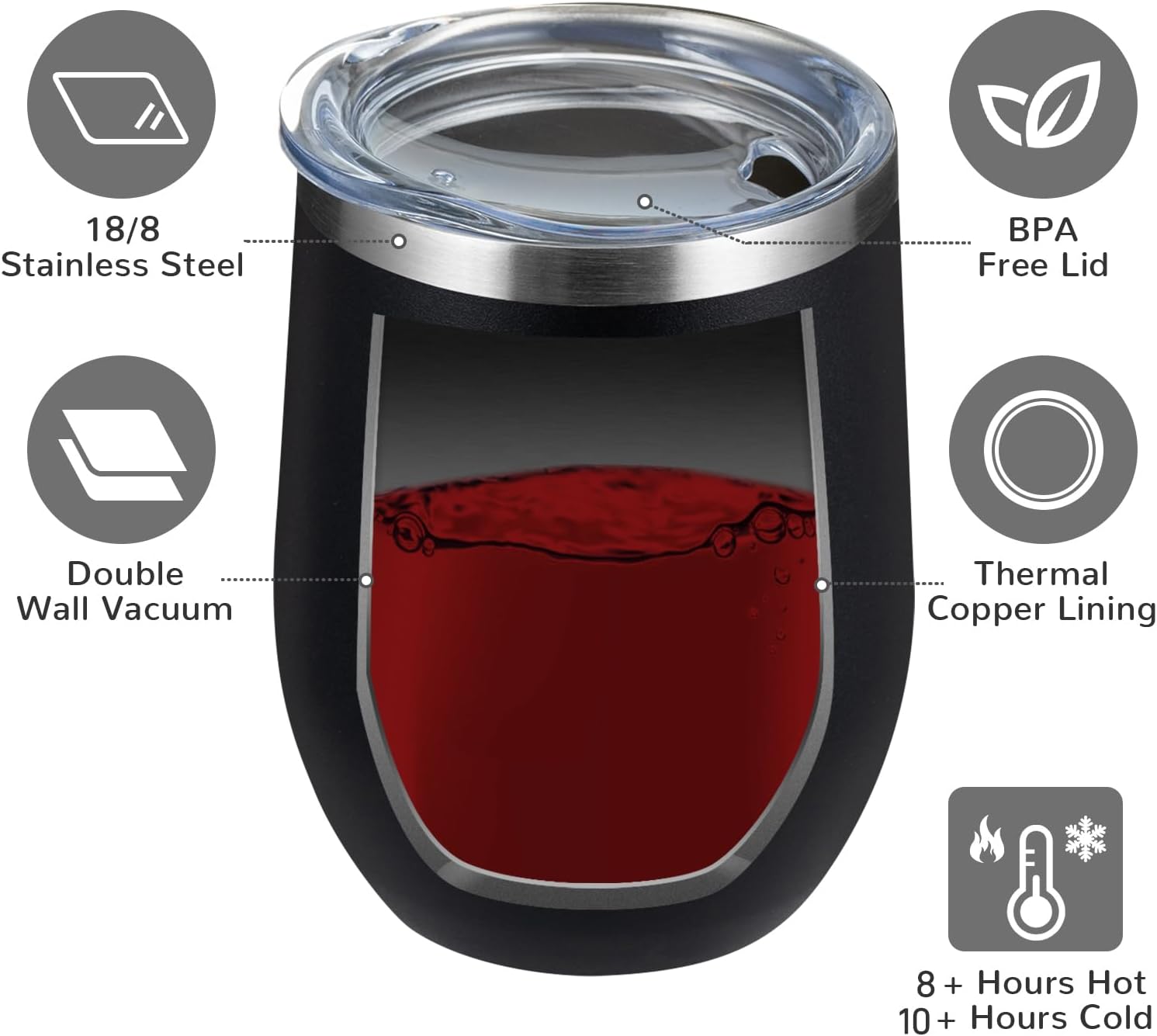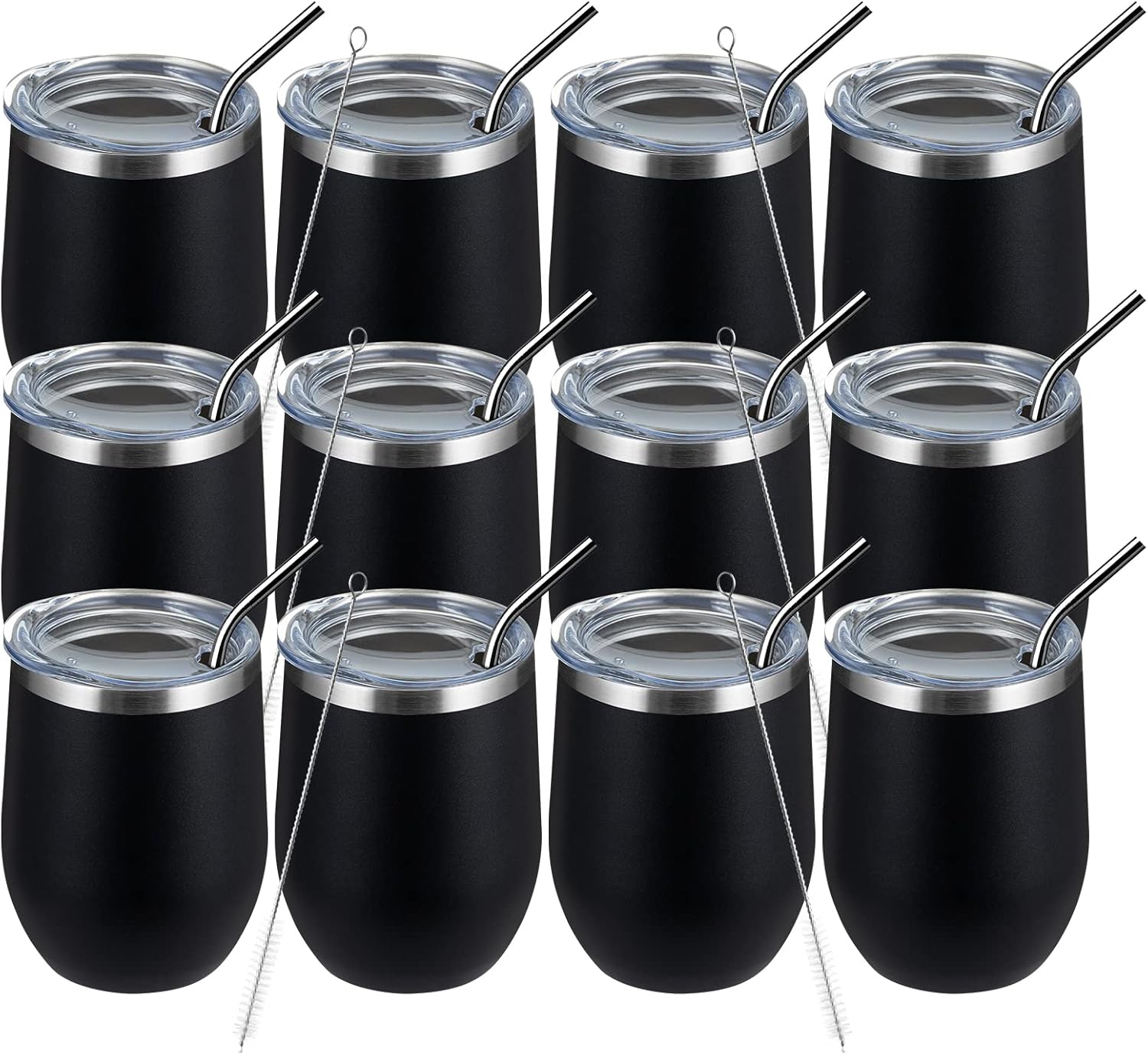 MEWAY 12oz/12 Pack Wine Tumbler Glasses with Lid -Double Wall Vacuum Stainless Steel Travel Tumbler Mug,Stemless Insulated Wine Cup for,Coffee,Cocktails,Gifts (Black,Set of 12)