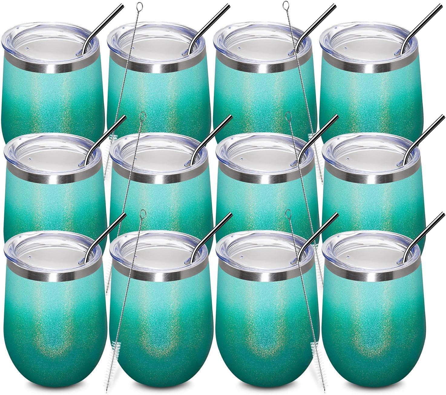 MEWAY 12oz/12 Pack Wine Tumbler Glasses with Lid - Stemless Double Wall Vacuum Stainless Steel Glitter Tumbler - Keeping Cold & Hot Cup for Coffee,for Women(Gradient Blue,Set of 12)