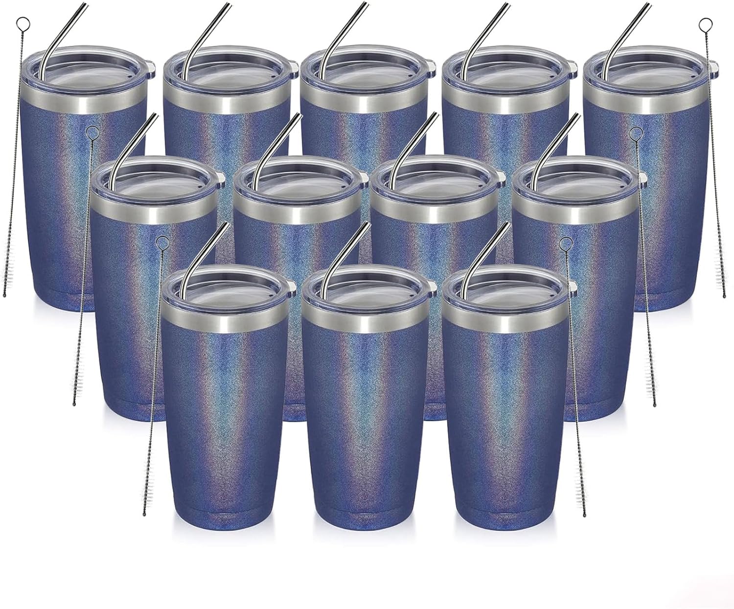 MEWAY 20oz Tumbler 12 Pack Double Wall Vacuum Insulated Travel Glitter Mug Bulk, Stainless Steel Tumblers with Lid and Straw, Powder Coated Coffee Cups for Woman(Rainbow Navy,Set of 12)