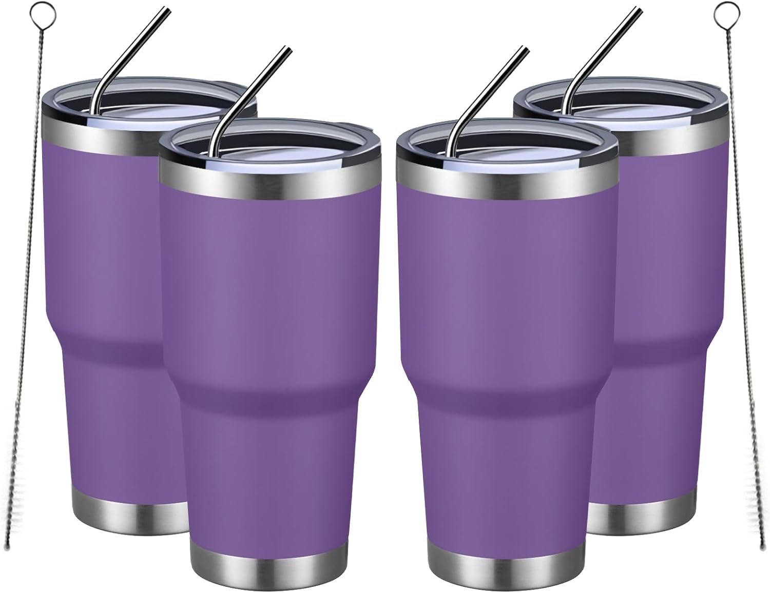 MEWAY 30oz Insulated Tumbler With Lids and Straws,Stainless Steel Double Vacuum Coffee Tumbler Cup, Brush, Durable Powder Coated Coffee Cup for Cold & Hot Drinks, Office, Travel(Purple,4 PACK)