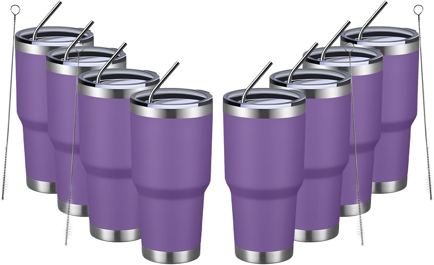 MEWAY 30oz Insulated Tumbler With Lids and Straws,Stainless Steel Double Vacuum Coffee Tumbler Cup, Brush, Durable Powder Coated Coffee Cup for Cold & Hot Drinks, Office, Travel(Purple,8 PACK)