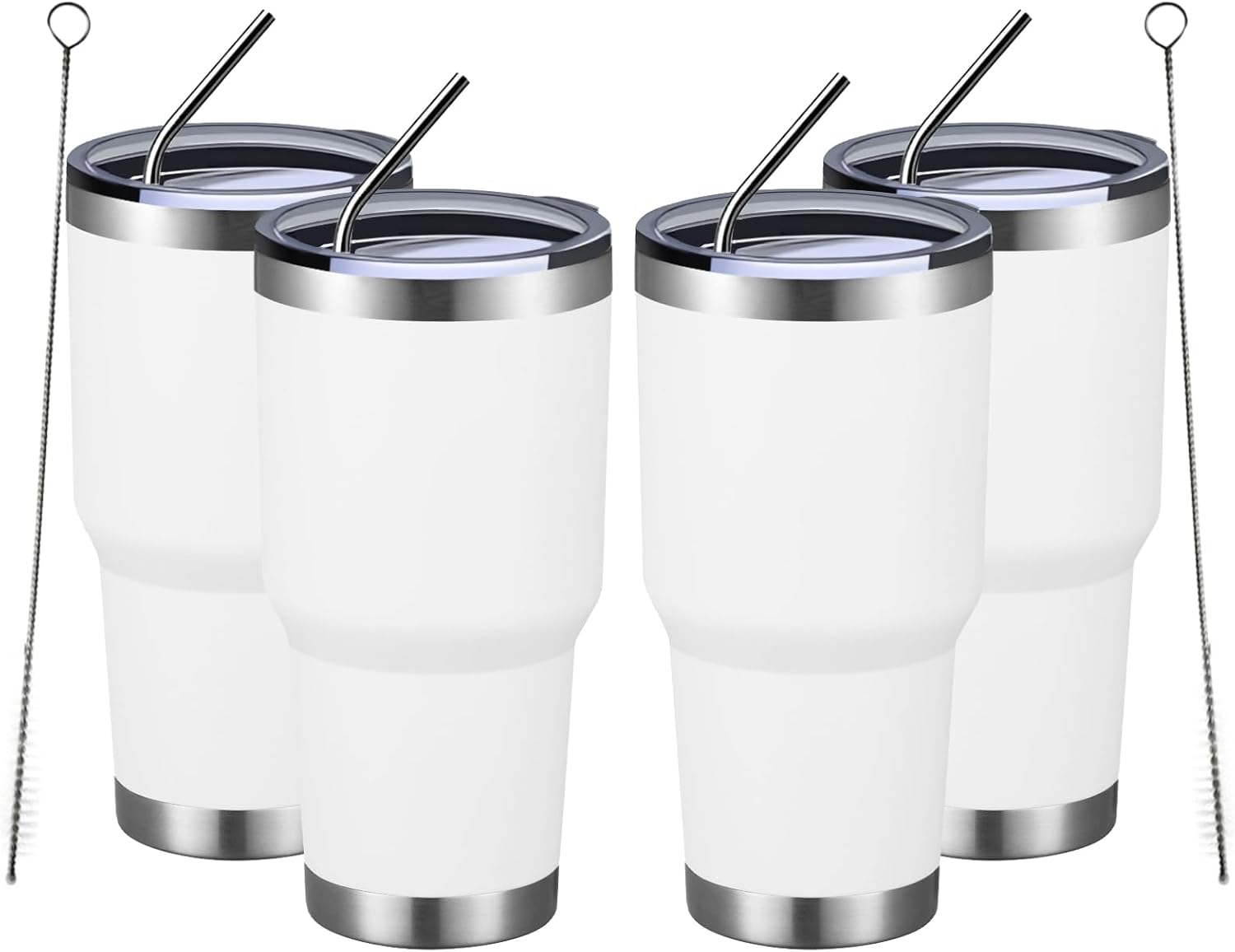 MEWAY 30oz Insulated Tumbler With Lids and Straws,Stainless Steel Double Vacuum Coffee Tumbler Cup, Brush, Durable Powder Coated Coffee Cup for Cold & Hot Drinks, Office(White,4 PACK)