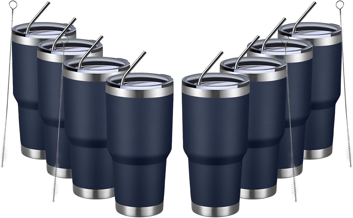 MEWAY 30oz Insulated Tumbler With Lids and Straws,Stainless Steel Double Vacuum Coffee Tumbler Cup, Brush, Durable Powder Coated Coffee Cup for Cold & Hot Drinks(Navy,8 PACK)