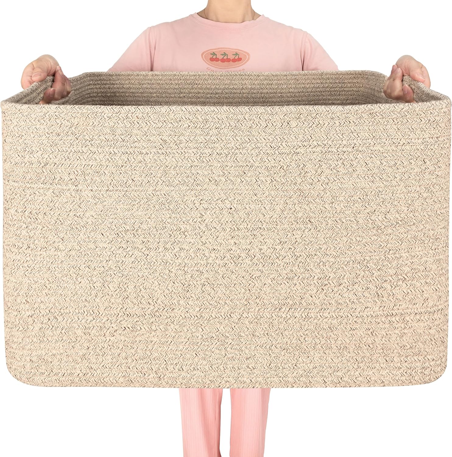 MINTWOOD Design 112L Extra Large Blanket Basket Holder Living Room, 25"x17"x16" Rectangle Rope Woven Storage Basket with Handles for Laundry, Towels, Shoes, Dog Toy Organizer Bin Box, Oatmeal Brown