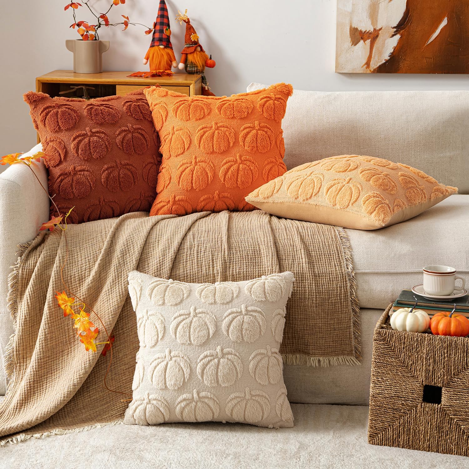 Fall Decor Essentials: Instantly elevate your living space with our set of 4 exquisite pillow covers. Featuring a charming embroidered pumpkin pattern, these decorative pillows are perfect for infusing your home with a warm and inviting fall decorations vibe, creating a cozy atmosphere for the season.
