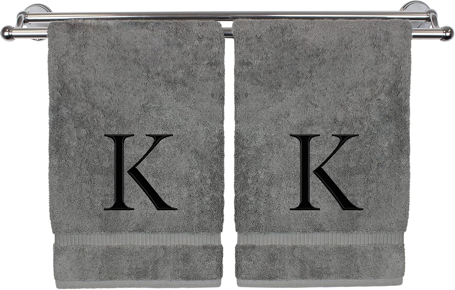Monogrammed Hand Towel, Personalized Gift, Set of 2- Black Block Letter Embroidered Towel - Extra Absorbent 100% Turkish Cotton - Soft Terry Finish - Initial K Gray