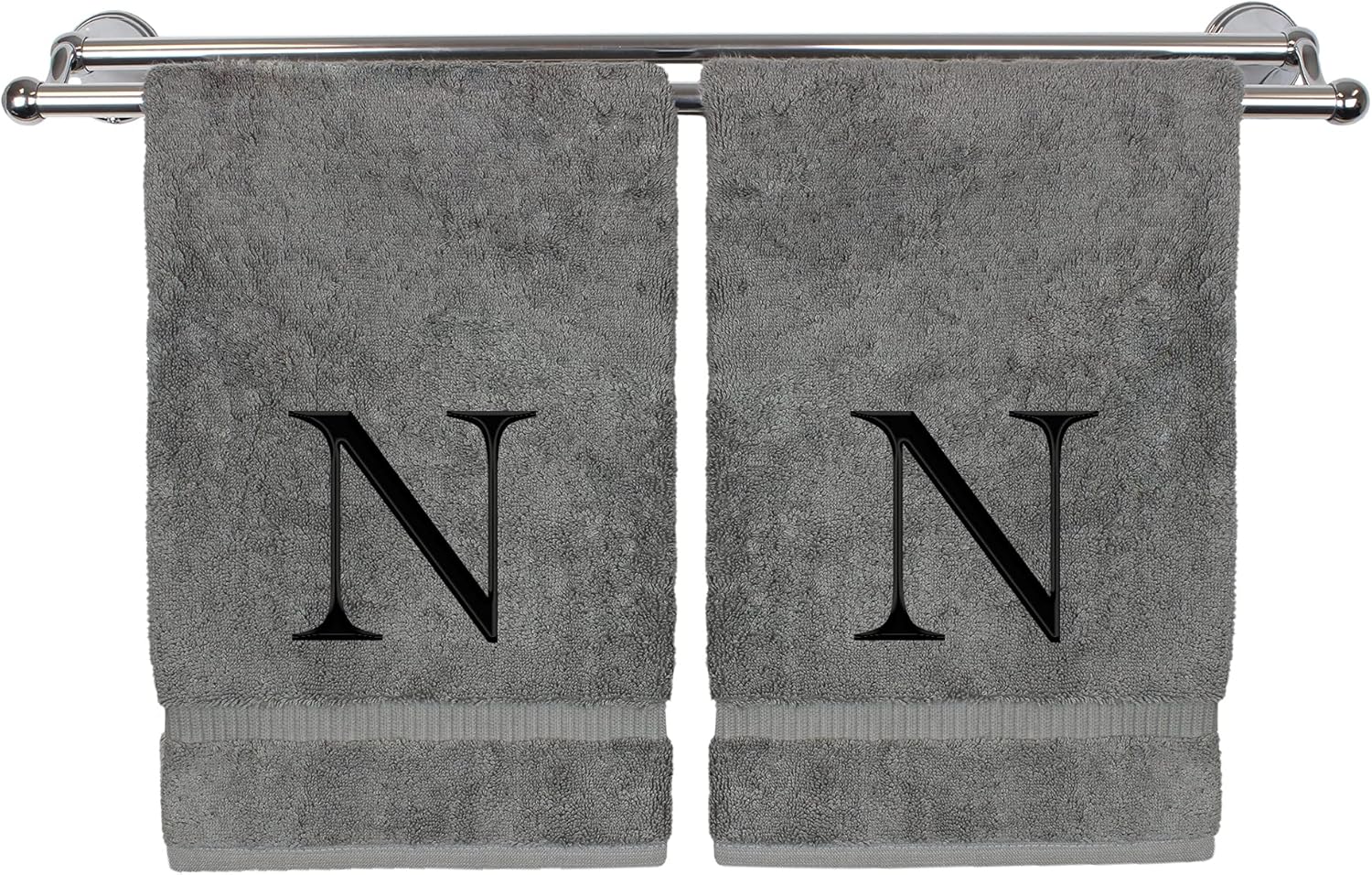 Monogrammed Hand Towel, Personalized Gift, Set of 2- Black Block Letter Embroidered Towel - Extra Absorbent 100% Turkish Cotton - Soft Terry Finish - Initial N Gray
