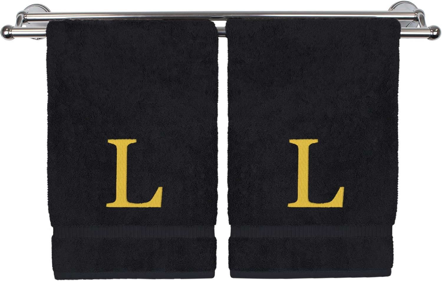 Monogrammed Hand Towel, Personalized Gift, Set of 2- Gold Block Letter Embroidered Towel - Extra Absorbent 100% Turkish Cotton - Soft Terry Finish - Initial L Black