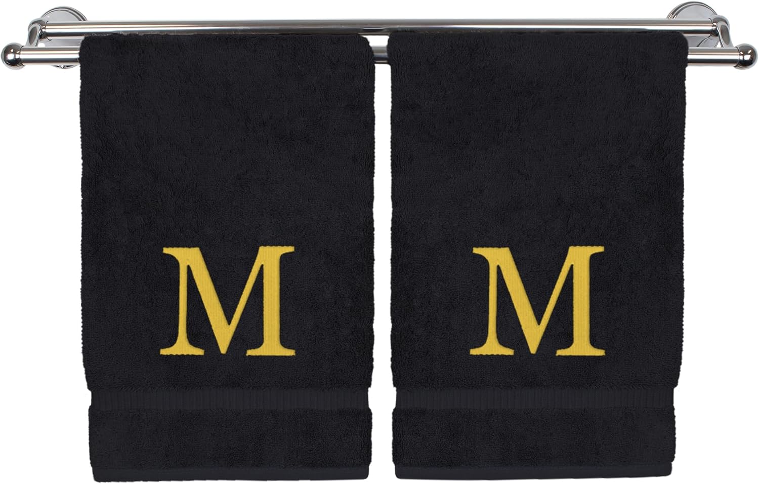 Monogrammed Hand Towel, Personalized Gift, Set of 2- Gold Block Letter Embroidered Towel - Extra Absorbent 100% Turkish Cotton - Soft Terry Finish - Initial M Black