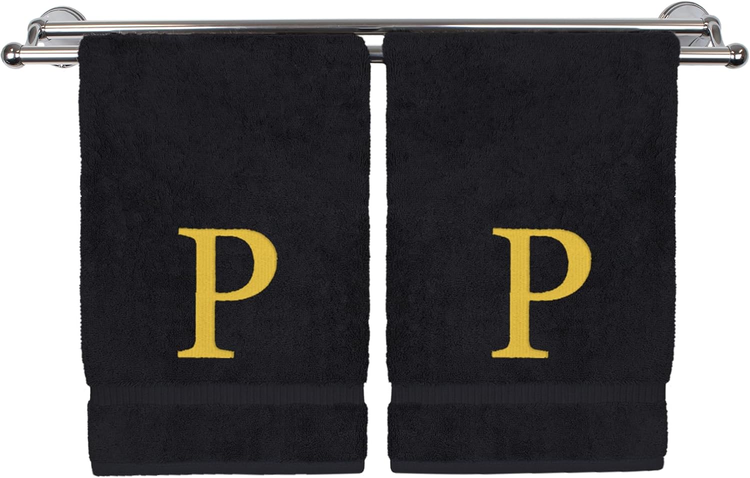 Monogrammed Hand Towel, Personalized Gift, Set of 2- Gold Block Letter Embroidered Towel - Extra Absorbent 100% Turkish Cotton - Soft Terry Finish - Initial P Black