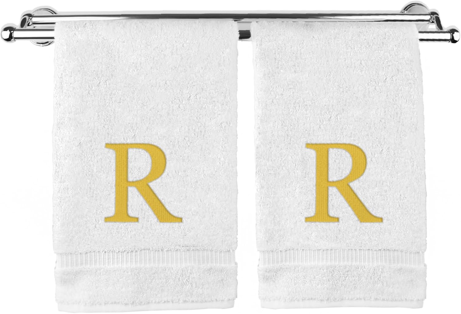 Monogrammed Hand Towel, Personalized Gift, Set of 2- Gold Block Letter Embroidered Towel - Extra Absorbent 100% Turkish Cotton - Soft Terry Finish - Initial R White