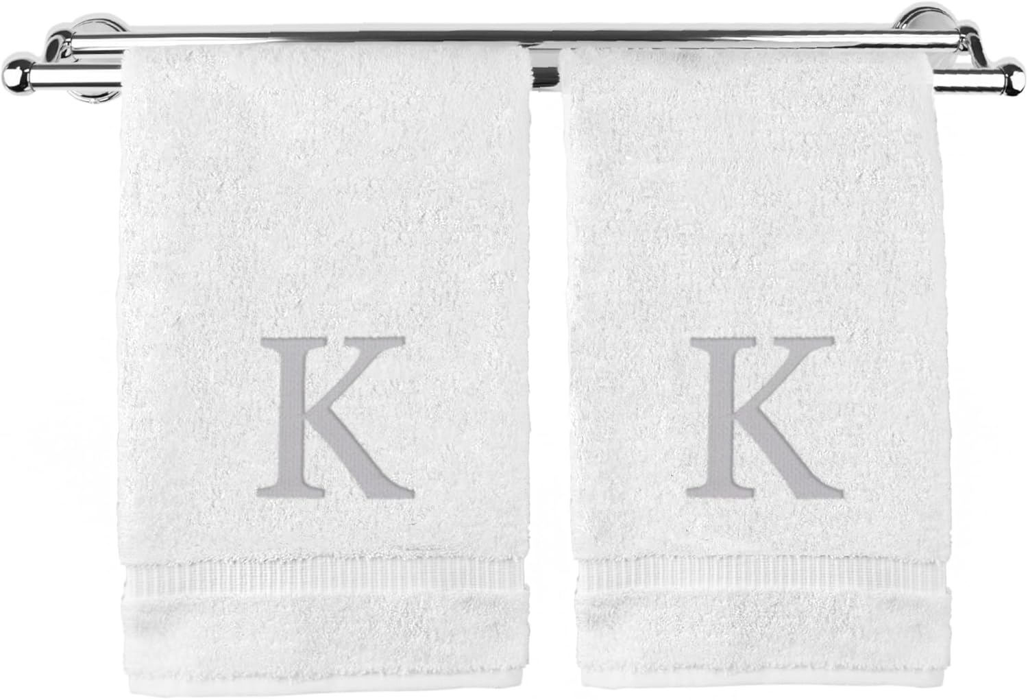 Monogrammed Hand Towel, Personalized Gift, Set of 2- Silver Block Letter Embroidered Towel - Extra Absorbent 100% Turkish Cotton - Soft Terry Finish - Initial K White