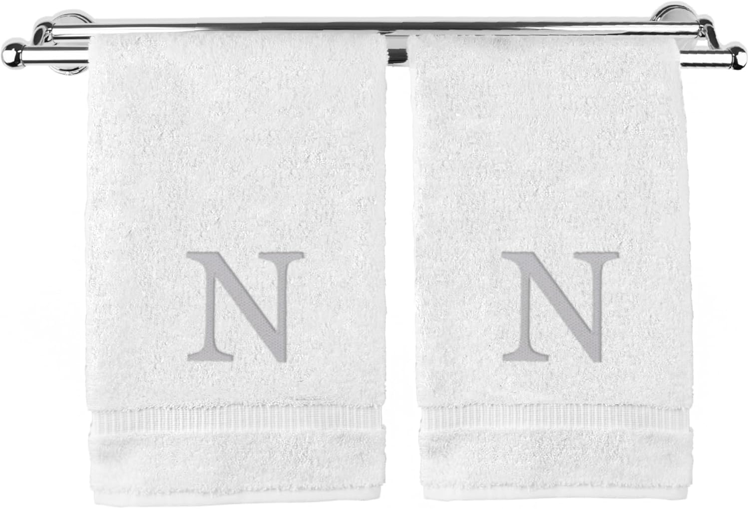 Monogrammed Hand Towel, Personalized Gift, Set of 2- Silver Block Letter Embroidered Towel - Extra Absorbent 100% Turkish Cotton - Soft Terry Finish - Initial N White