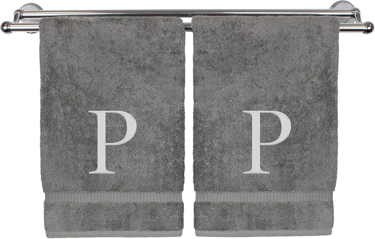Monogrammed Hand Towel, Personalized Gift, Set of 2- Silver Block Letter Embroidered Towel - Extra Absorbent 100% Turkish Cotton - Soft Terry Finish - Initial P Gray
