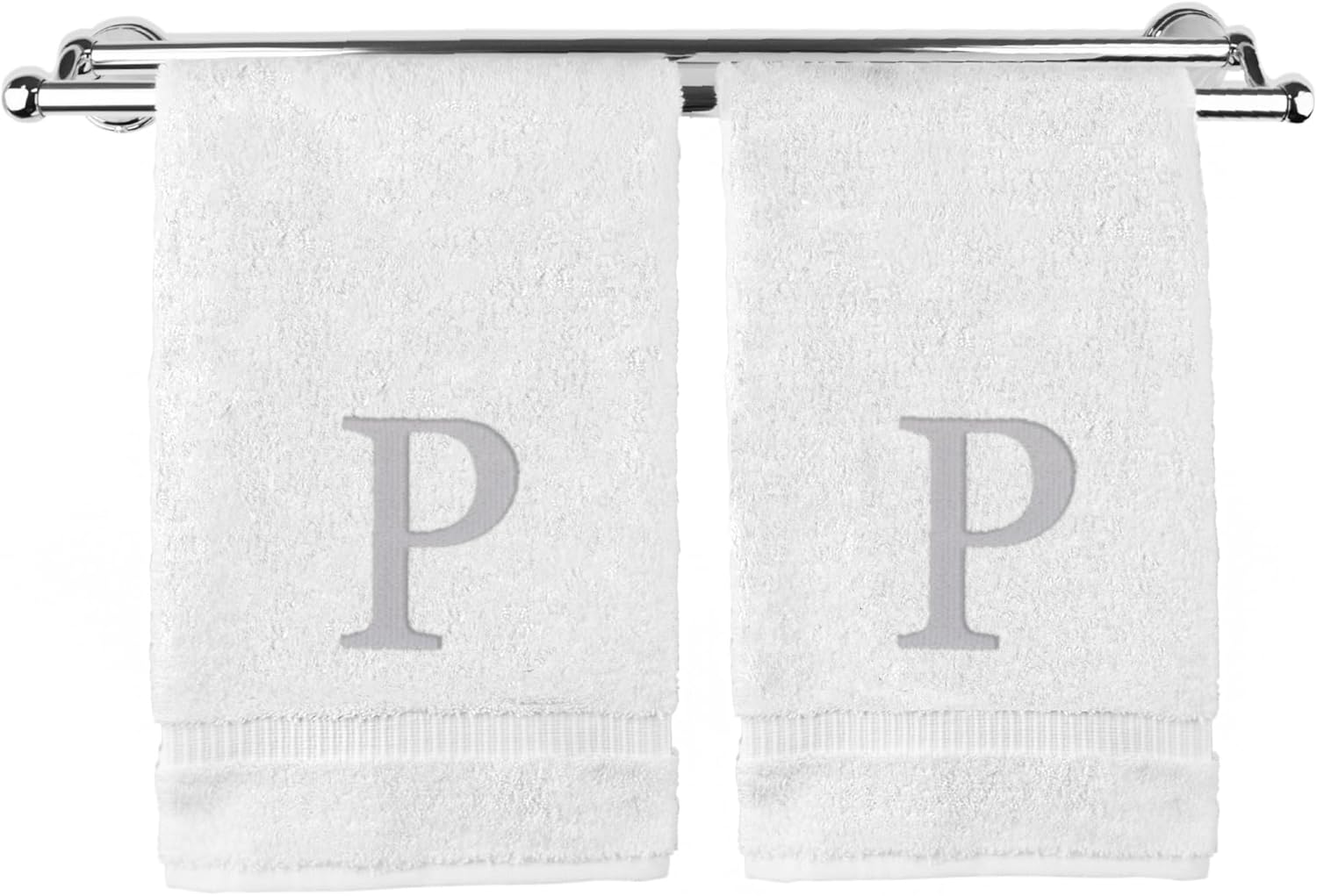Monogrammed Hand Towel, Personalized Gift, Set of 2- Silver Block Letter Embroidered Towel - Extra Absorbent 100% Turkish Cotton - Soft Terry Finish - Initial P White