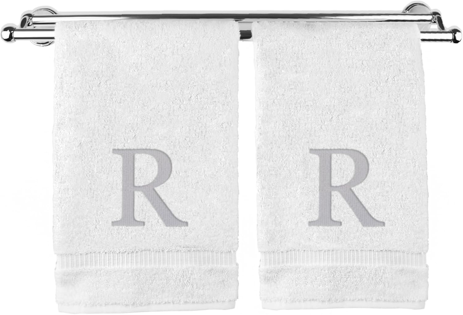 Monogrammed Hand Towel, Personalized Gift, Set of 2- Silver Block Letter Embroidered Towel - Extra Absorbent 100% Turkish Cotton - Soft Terry Finish - Initial R White