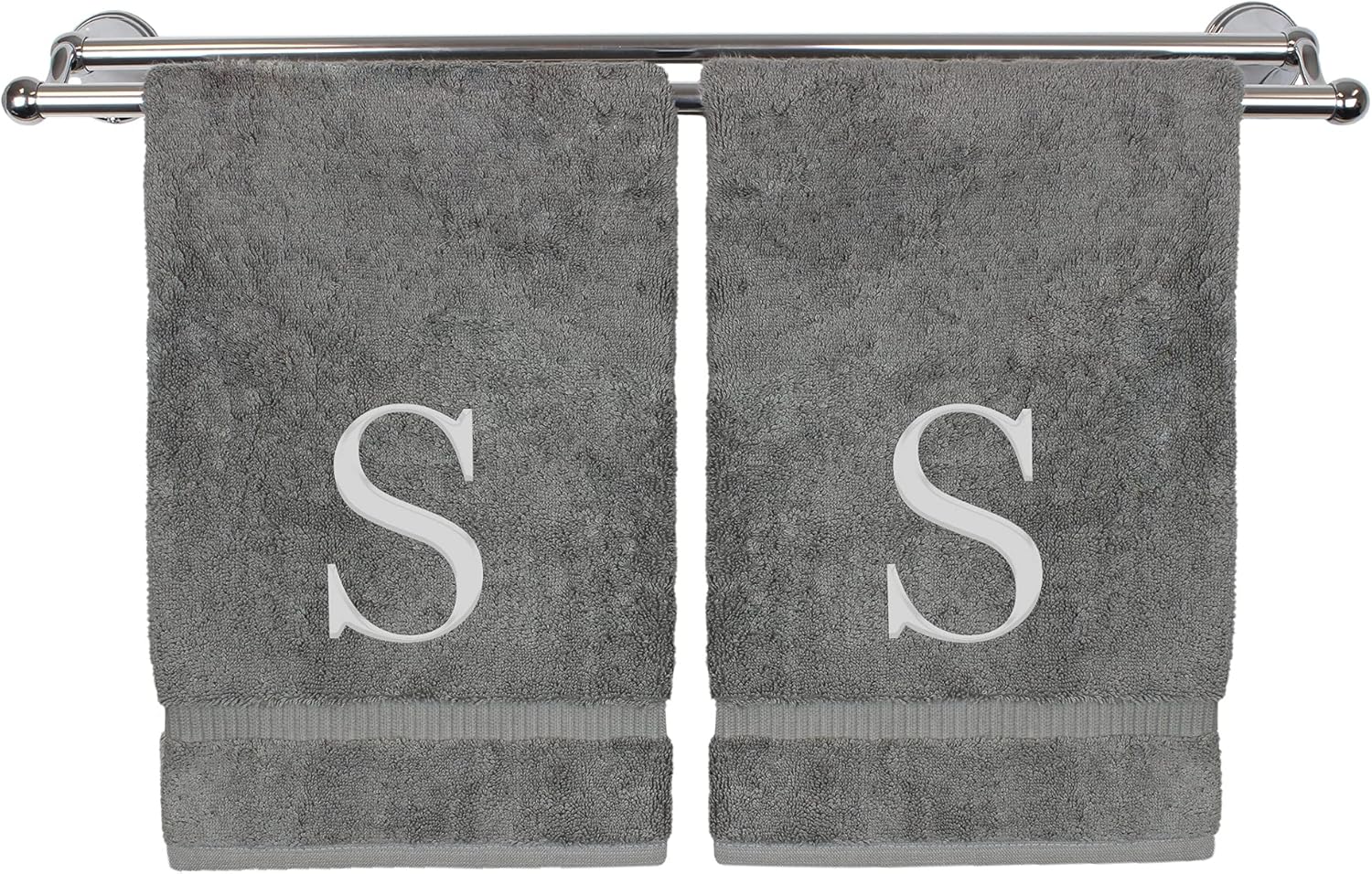 Monogrammed Hand Towel, Personalized Gift, Set of 2- Silver Block Letter Embroidered Towel - Extra Absorbent 100% Turkish Cotton - Soft Terry Finish - Initial S Gray