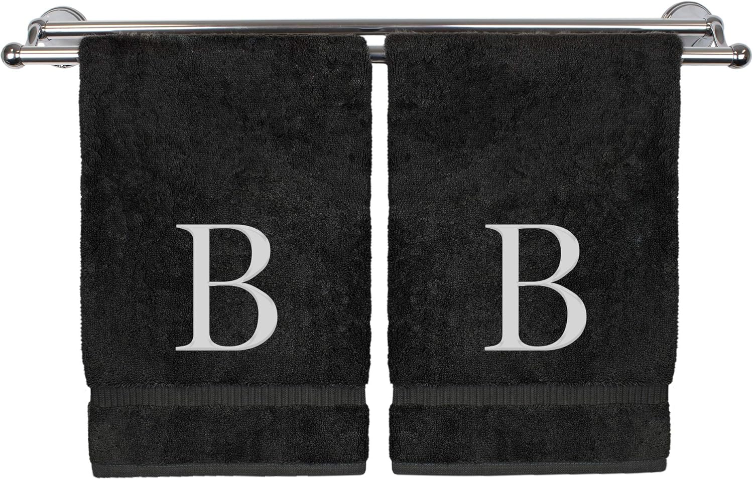 Monogrammed Hand Towel, Personalized Gift, Set of 2- White Block Letter Embroidered Towel - Extra Absorbent 100% Turkish Cotton - Soft Terry Finish - Initial B Black