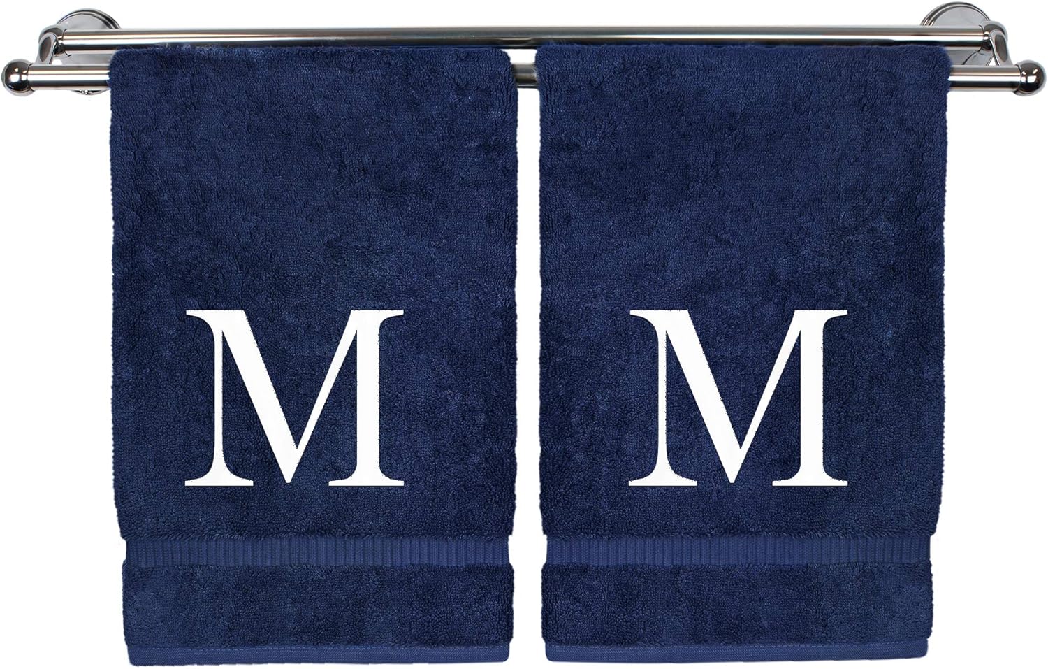 Monogrammed Hand Towel, Personalized Gift, Set of 2- White Block Letter Embroidered Towel - Extra Absorbent 100% Turkish Cotton - Soft Terry Finish - Initial M Navy