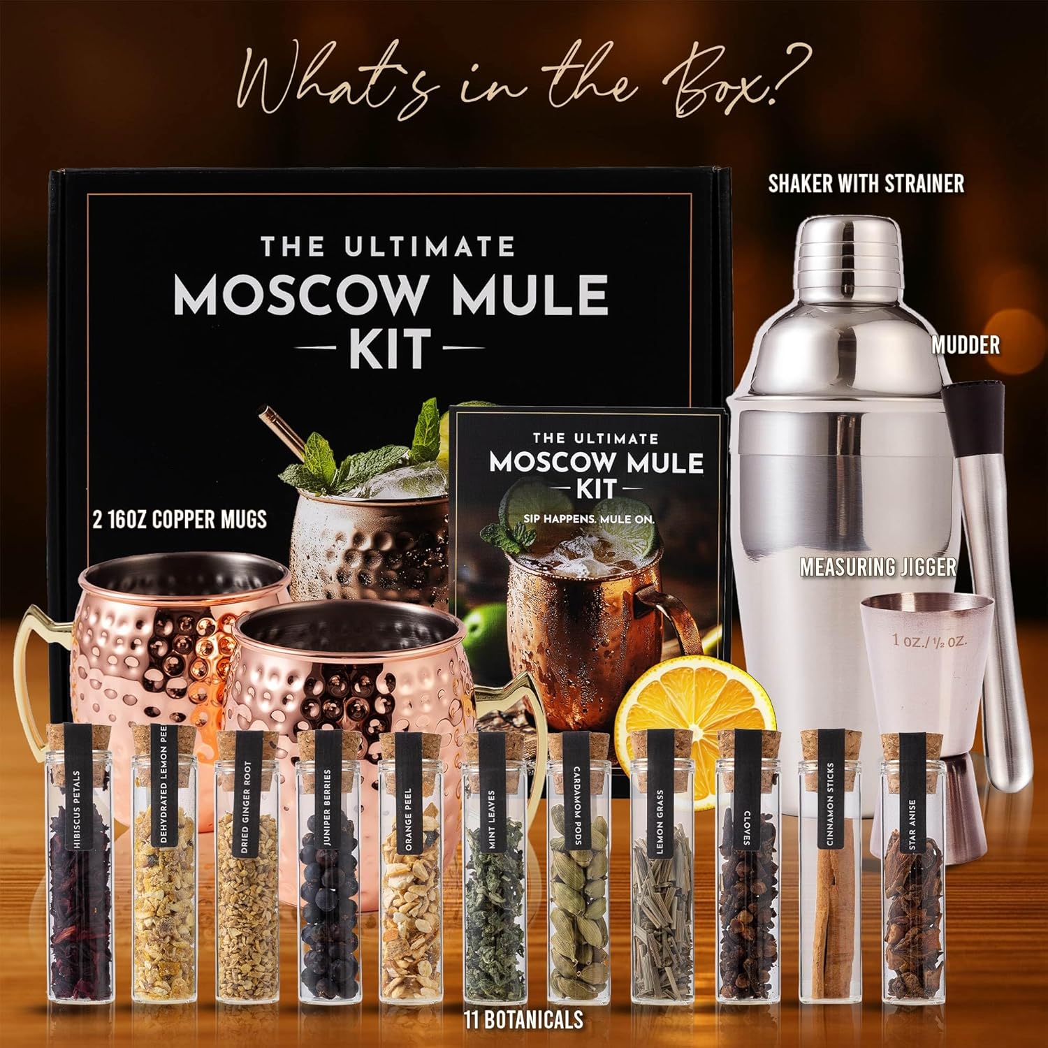 ELEVATE YOUR MIXOLOGY GAME – COMPLETE MOSCOW MULE KIT GIFT SET - Craft the perfect cocktail with this premium 2-copper mug mule set featuring a 550ml stainless steel cocktail shaker, jigger, muddler & 11 exotic botanicals for next-level flavor infusions