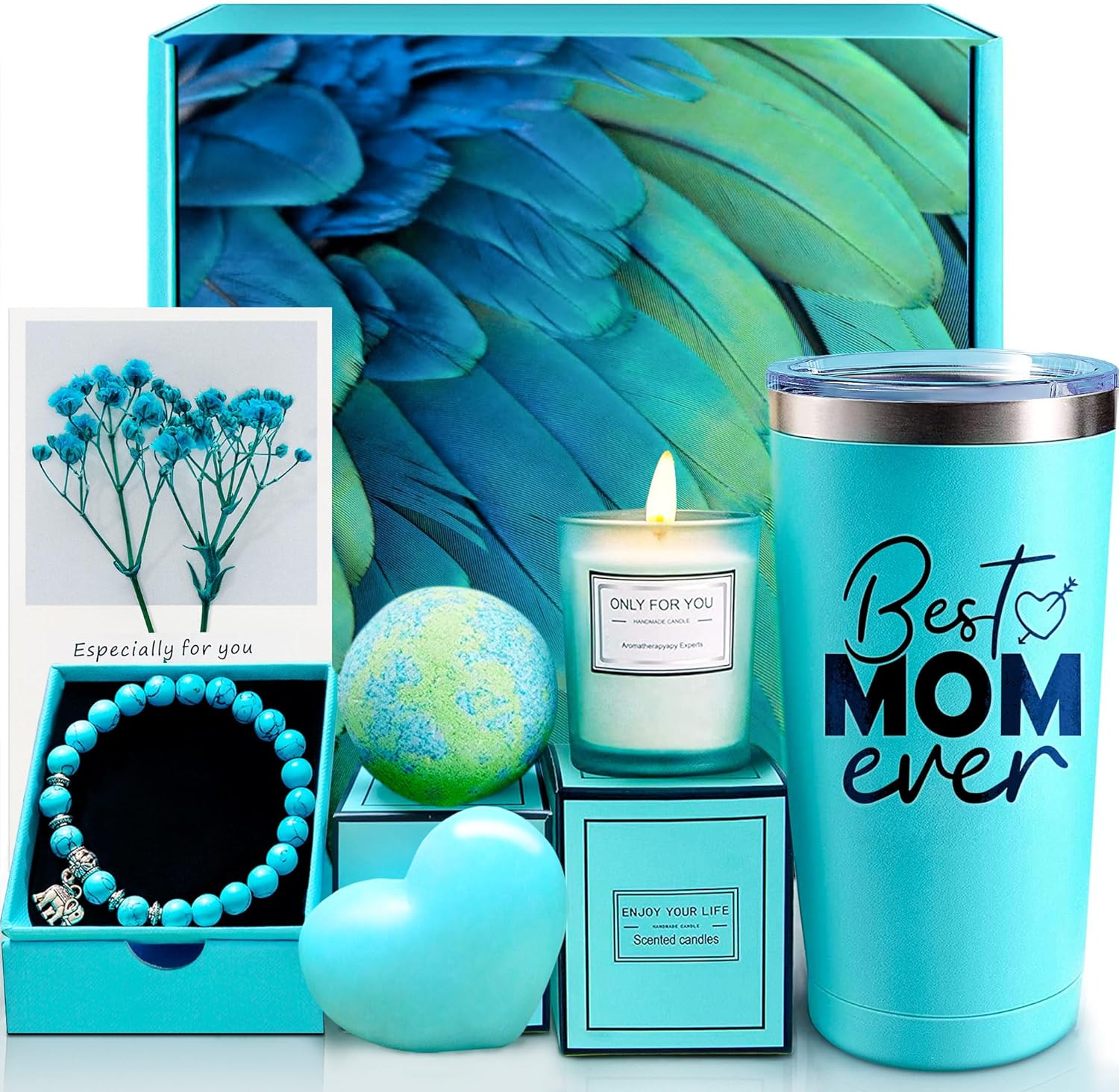 Relaxing Spa Gift Basket for Mom - Unsure of what she might like? This mom gift box is an ideal choice! Inside, you'll find a 20oz insulated stainless steel tumbler featuring the heartfelt message "Best Mom Ever," pure handmade soap, a luxurious bath bomb, bath salt, a beautiful turquoise bracelet, a calming soy candle, and a card for your special message. Ideal as Mom Christmas gifts , Mom Birthday Gifts, Mom New Year Thanksgiving gifts, Mom Valentines Day Gifts