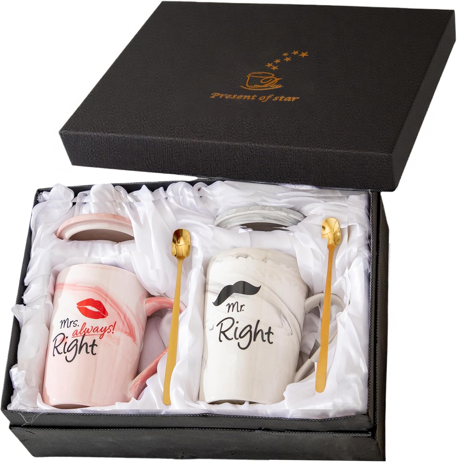 MR AND MRS MUGS FOR COUPLES GIFTS - Mugs gift sets package include:1 *Mr. Right and 1* Mrs. Always Right mugs.Fantastic gift idea for Fathers day, Mothers day, birthday, Valentine's Day, Anniversaries, Weddings,Engagement or Christmas.