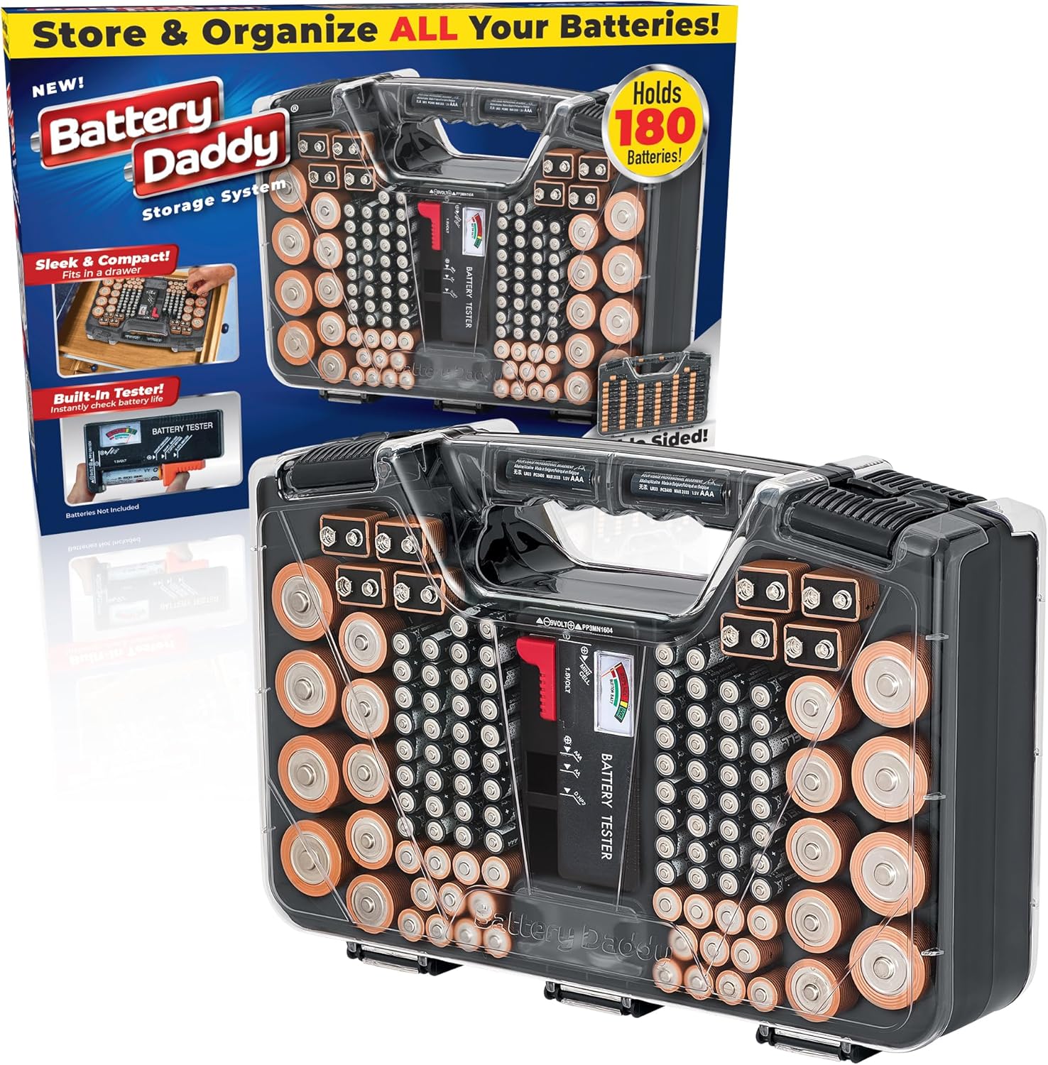 Double-Sided Battery Organizer: The Ontel Battery Daddy is a compact & portable way to organize, store and protect a boatload of batteries! Clear 'Easy View' cover lets you see everything at a glance and prevent any unwanted contact