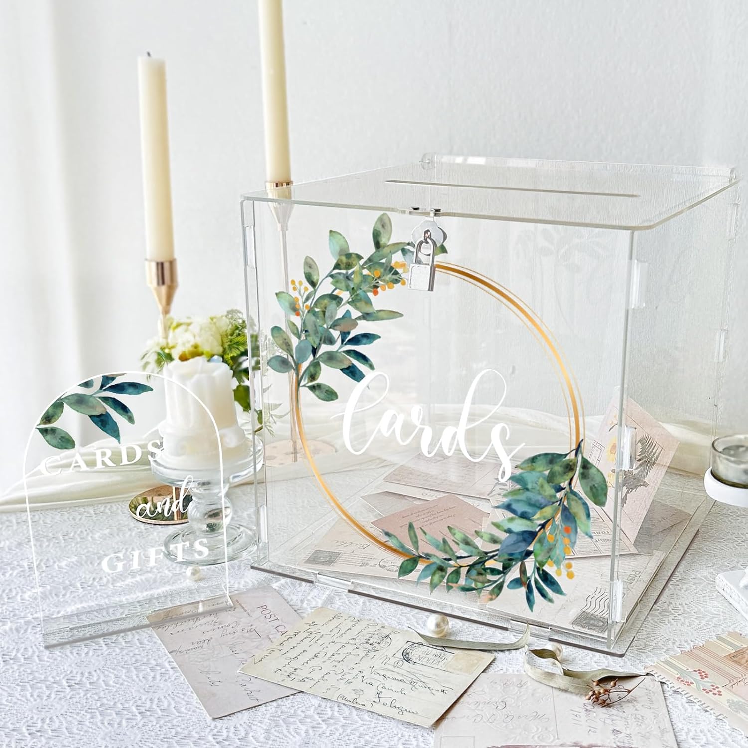 OurWarm Large Clear Wedding Card Box with Lock & Slot, Thick Acrylic, Eucalyptus Money Gift Card Storage Box for Wedding, Graduation, Birthday, Baby Shower Decorations