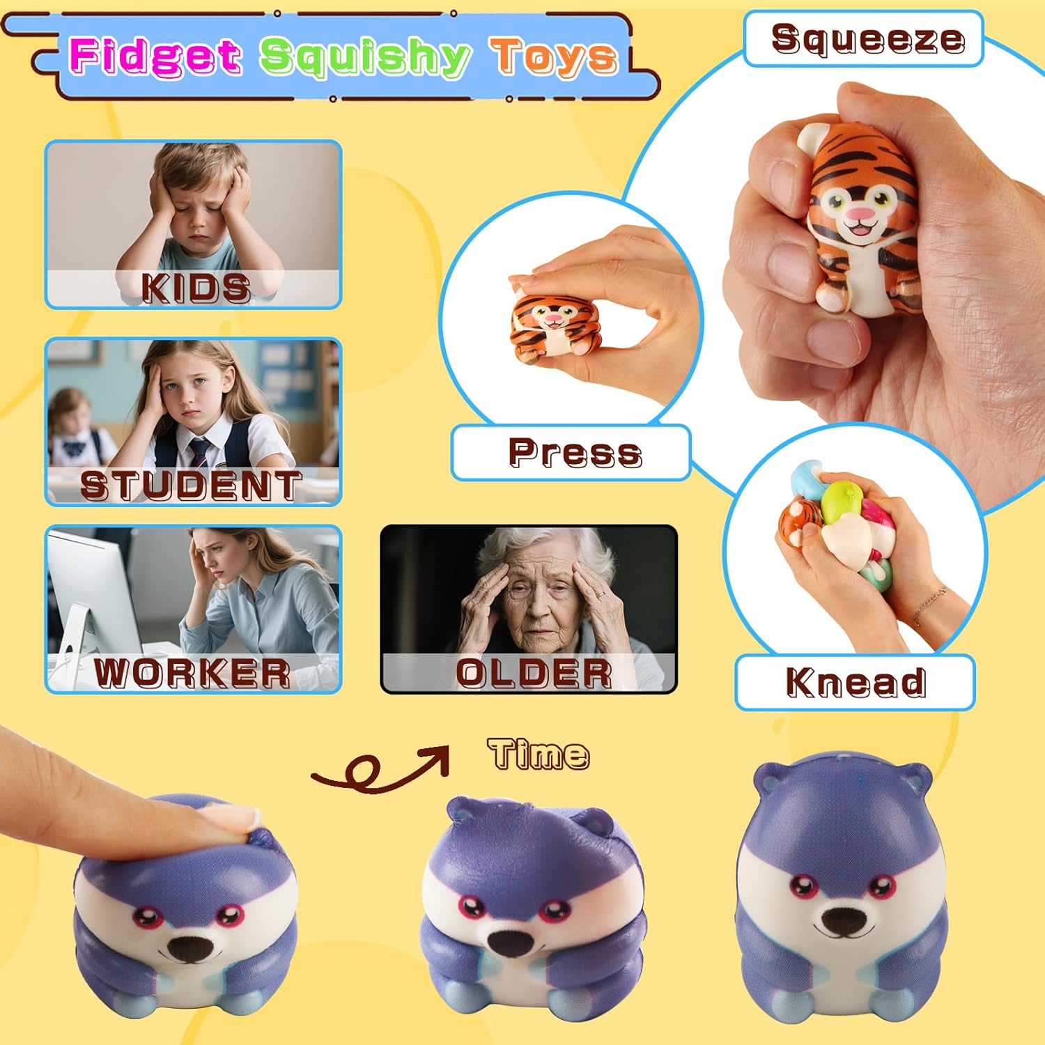 【Stress and Anxiety Relief】Soft toys can withstand a lot of squeezing, pinching, fidgeting and stretching, when you press the toys and release them, the Animal Squishy Toys will slowly return to the state before they were pressed; The slow rise of the Animal Squishy Toys allows children to train their hands and improve finger dexterity, which is beneficial to improving children's memory and learning efficiency, and also helps to relieve stress and anxiety.