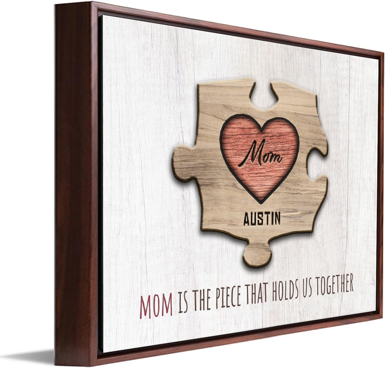 PERSONALIZED: This unique print features “MOM” as the center puzzle piece with all of her children’s names as part of the art as whimsical wooden pieces. You can even include “DAD” and the pets. Below the custom printed art puzzle is the phrase “MOM is the piece that holds us together.”