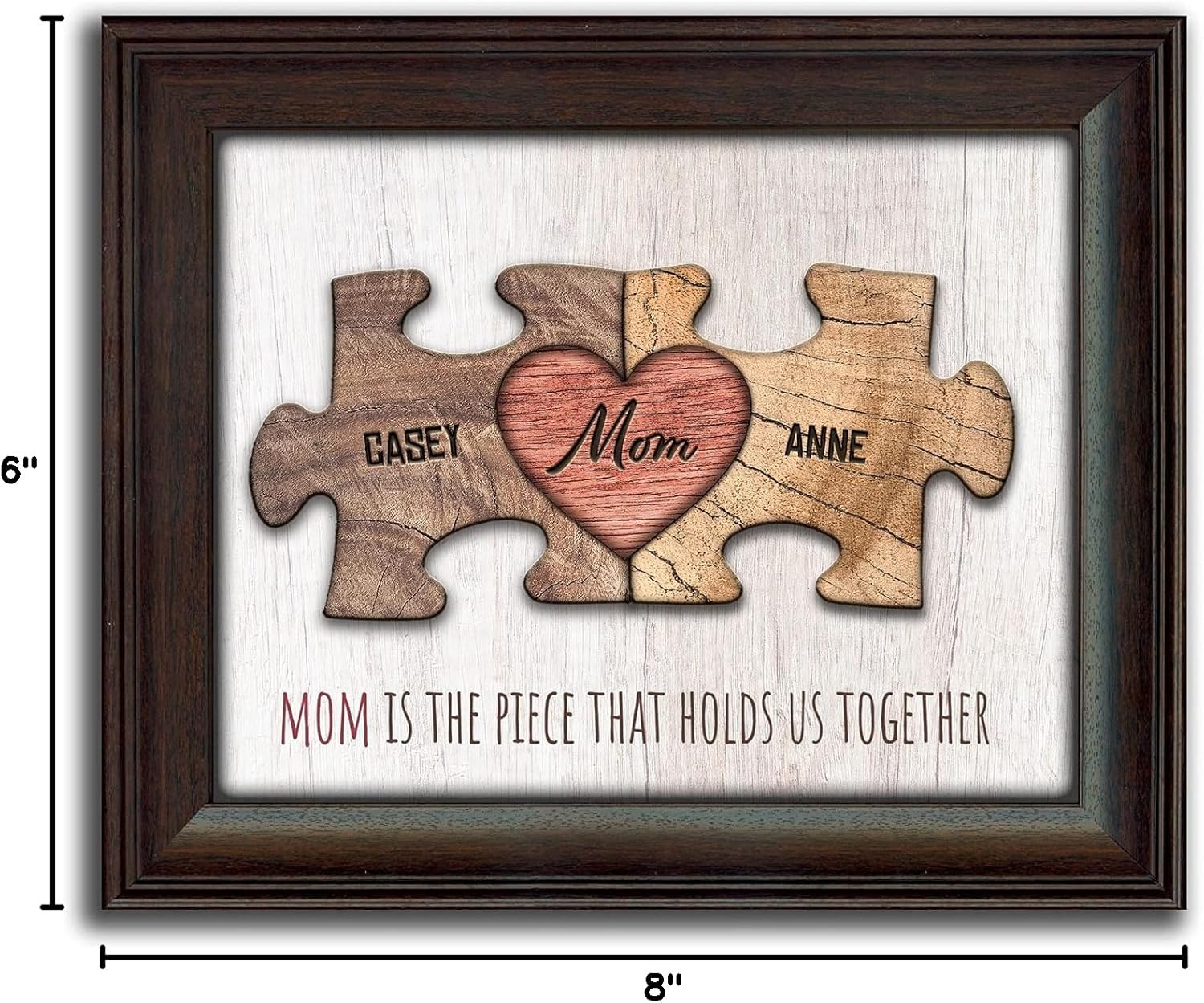 PERSONALIZED: This unique print features “MOM” as the center puzzle piece with all of her children’s names as part of the art as whimsical wooden pieces. You can even include “DAD” and the pets. Below the custom printed art puzzle is the phrase “MOM is the piece that holds us together.”