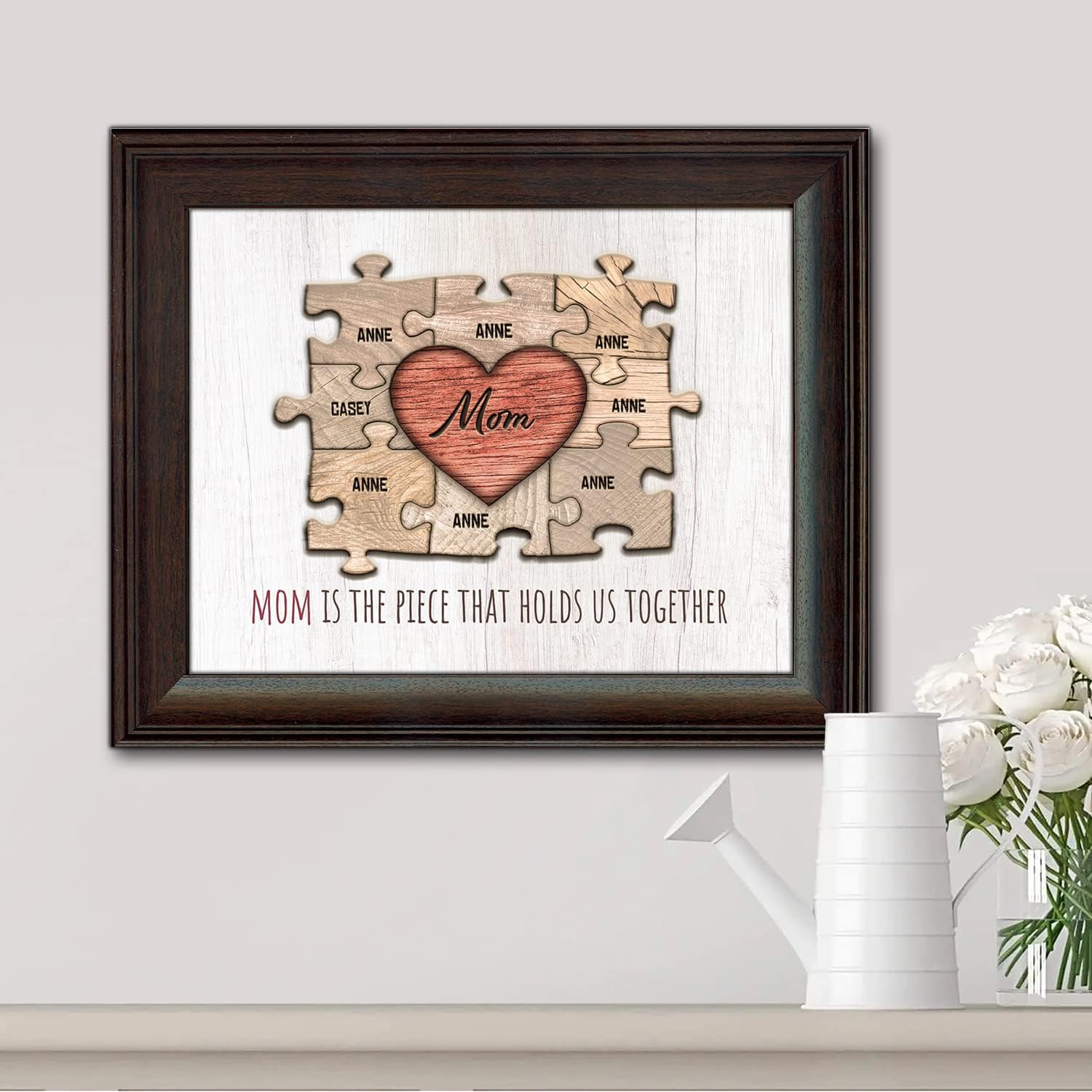 PERSONALIZED: This unique print features “MOM” as the center puzzle piece with all of her children’s names as part of the art as whimsical wooden pieces. You can even include “DAD” and the pets. Below the custom printed art puzzle is the phrase “MOM is the piece that holds us together.”