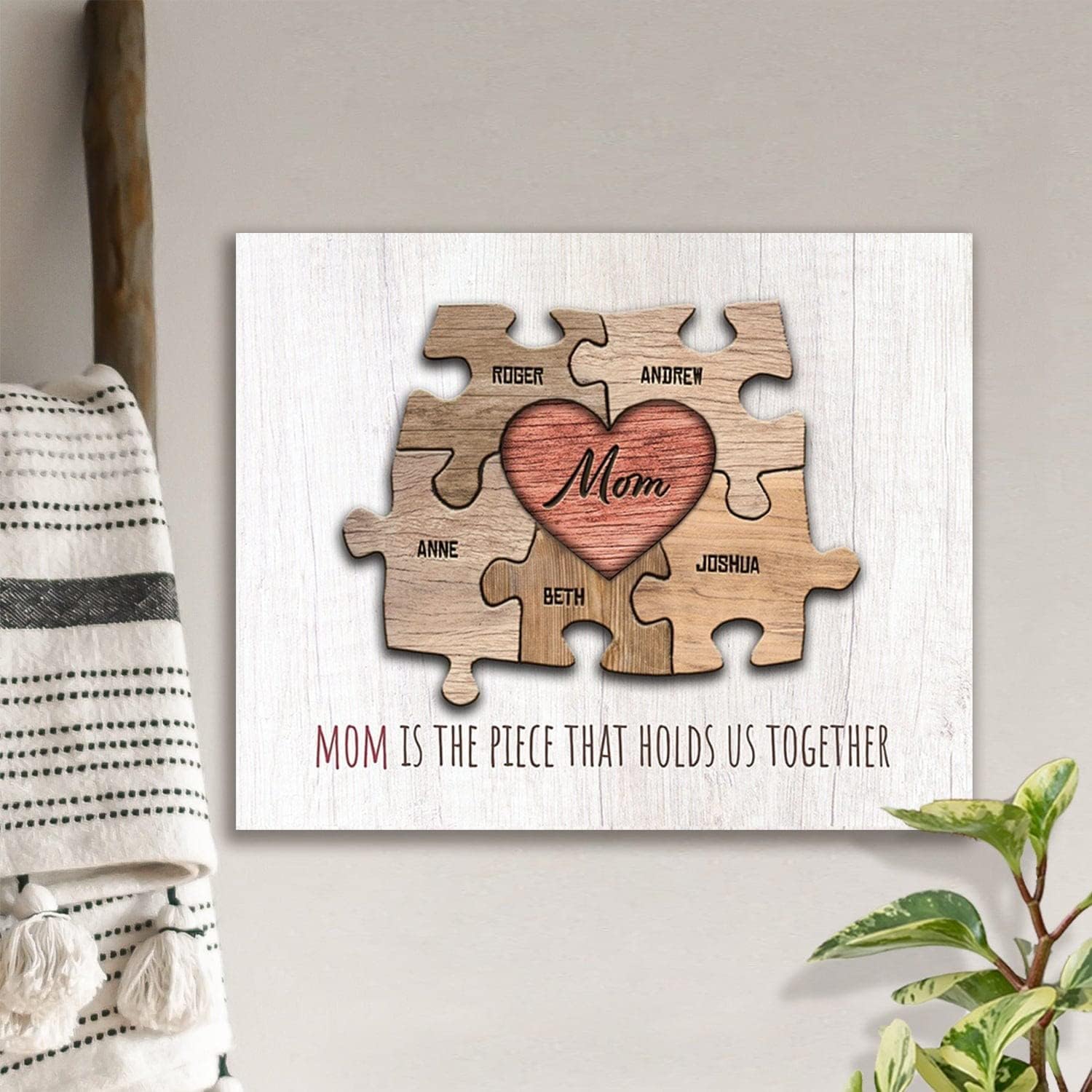 PERSONALIZED: This unique print features “MOM” as the center puzzle piece with all of her children’s names as part of the art as whimsical wooden pieces. You can even include “DAD” and the pets. Below the custom printed art puzzle is the phrase “MOM is the piece that holds us together.”