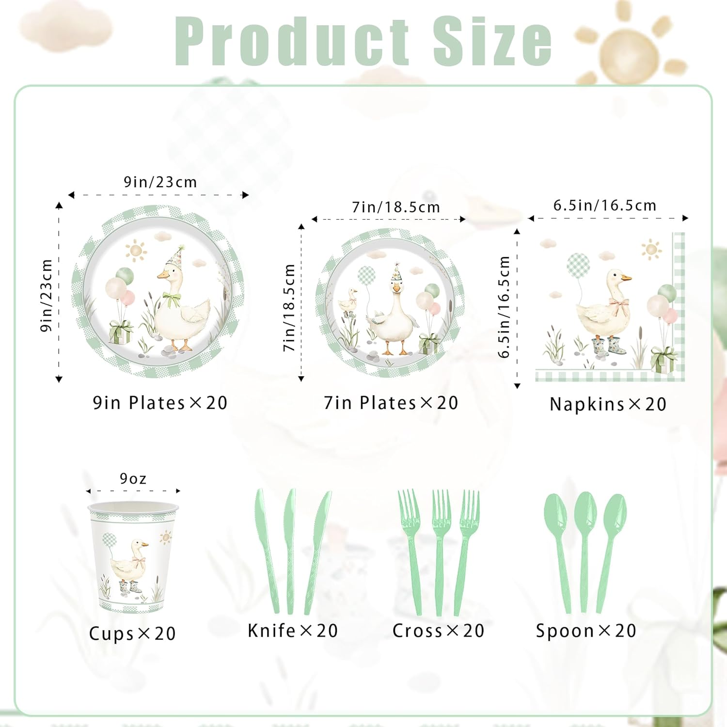 What You Can Get: You will get rubber duckies party supplies serves for 20 guests.Packing include 20pcs 9inch duck pinata plates,20pcs 7inch baby shower plates,20pcs 6.5inch napkins,20pcs cups,20pcs forks and knives,20pcs spoon. The sufficient Tableware set create a lovely and warm birthday party