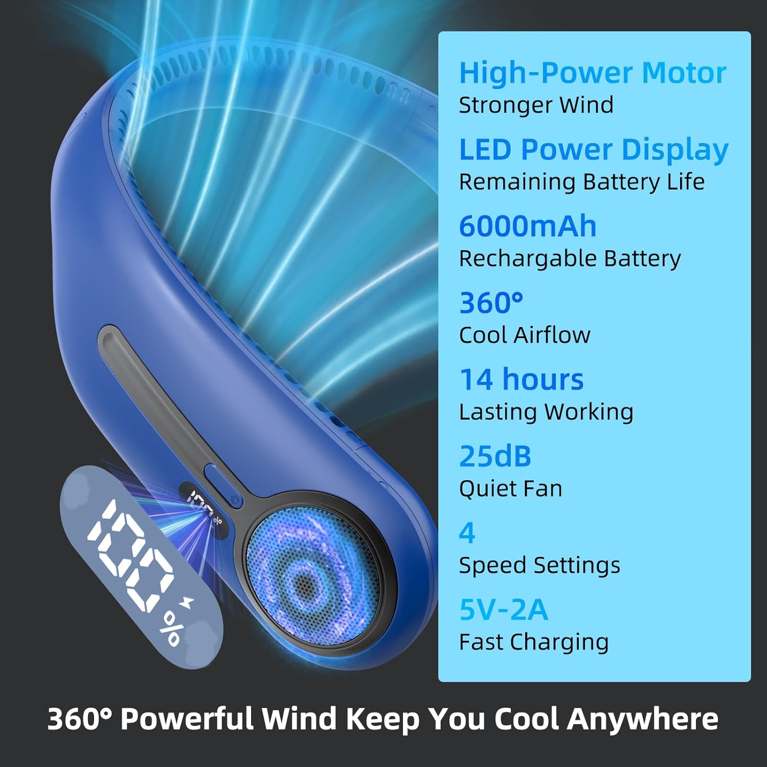 Portable Neck Fan,Gift Ideas,Personal Wearable Bladeless Fan,360° Cooling,LED Display,4-Speeds,6000mAh Rechargeable,Powerful Wind,Outdoor Travel Camping,Birthday Gifts for Men Women Dad Mom (Navy)