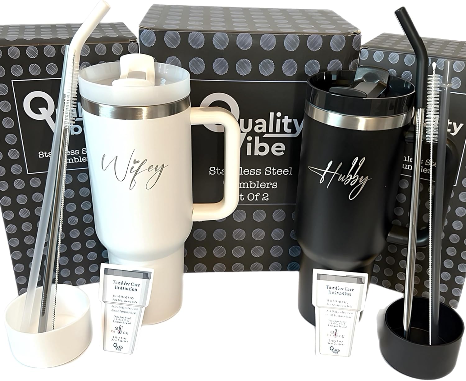 QualityVibe Wifey & Hubby Wedding Gift 40 oz Engraved Tumbler Set Of 2 For couples With Straw & Brush. Christmas or Engagement Gift Set For Bride & Groom.