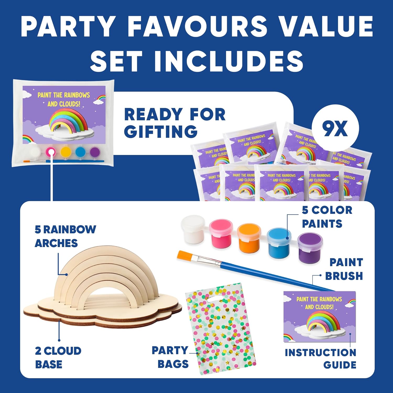 VALUE SET RAINBOW PARTY FAVORS - This bulk party favors for kids contains everything you need. The box includes 9 premade goodie bags. Each rainbow craft gift pack includes 1 Rainbow, 6 Pastel Colors Paint-strip & Paintbrush