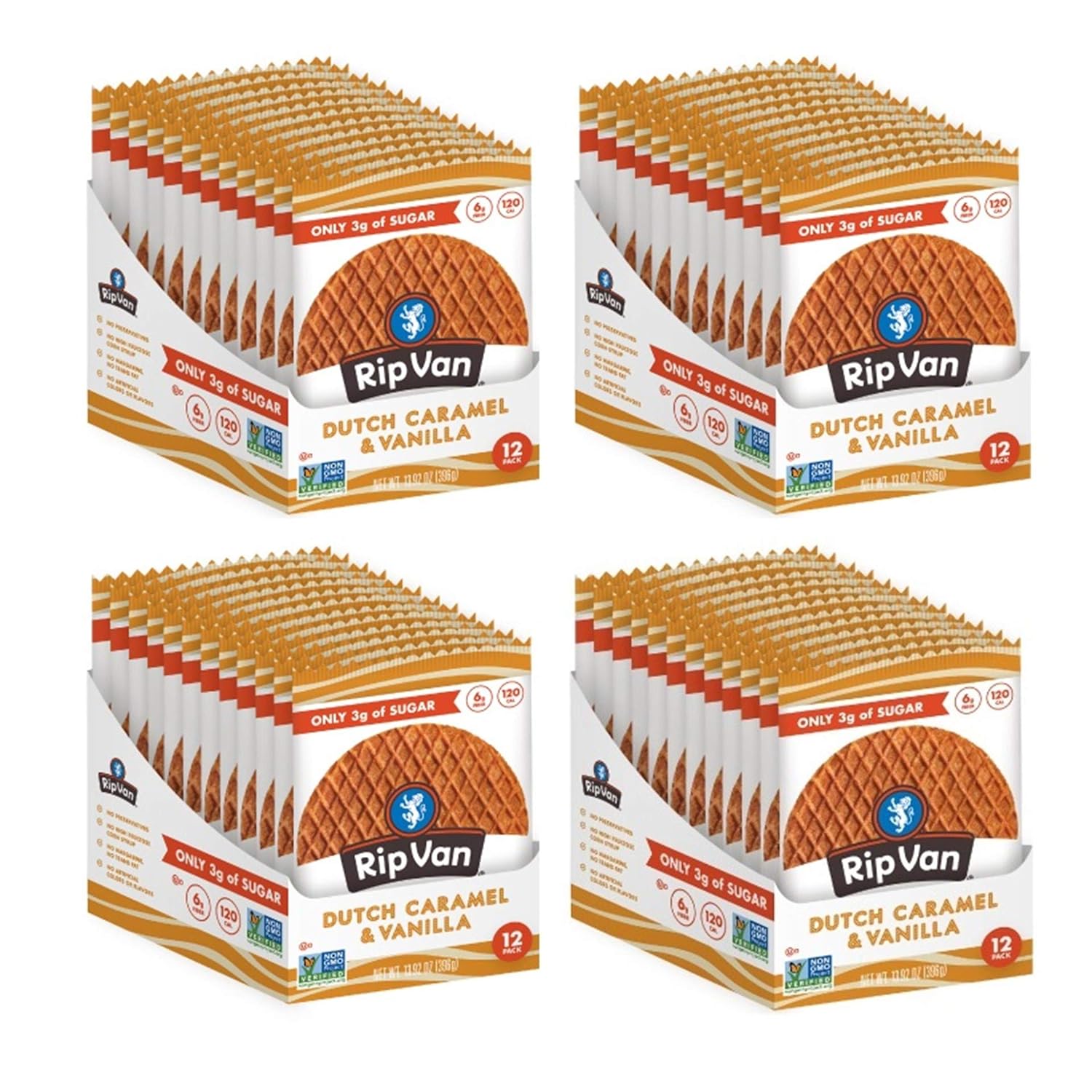 Rip Van Wafels Dutch Caramel & Vanilla Stroopwafels - Healthy Snacks - Non GMO- Keto Friendly - Office Snacks - Low Sugar (3g) - Low Calorie- 48 Pack