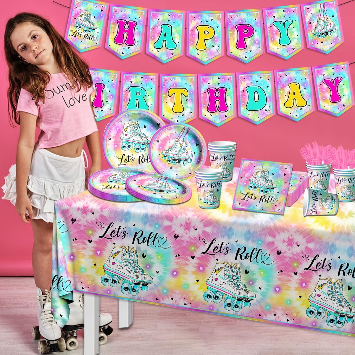 Roller Skating Party Supplies - 142Pcs Roller Skate Party Tableware Include Plates,Napkins,Cups,Banner,Tablecloth Let's Roll Birthday Decorations for Girl(20 Guests)