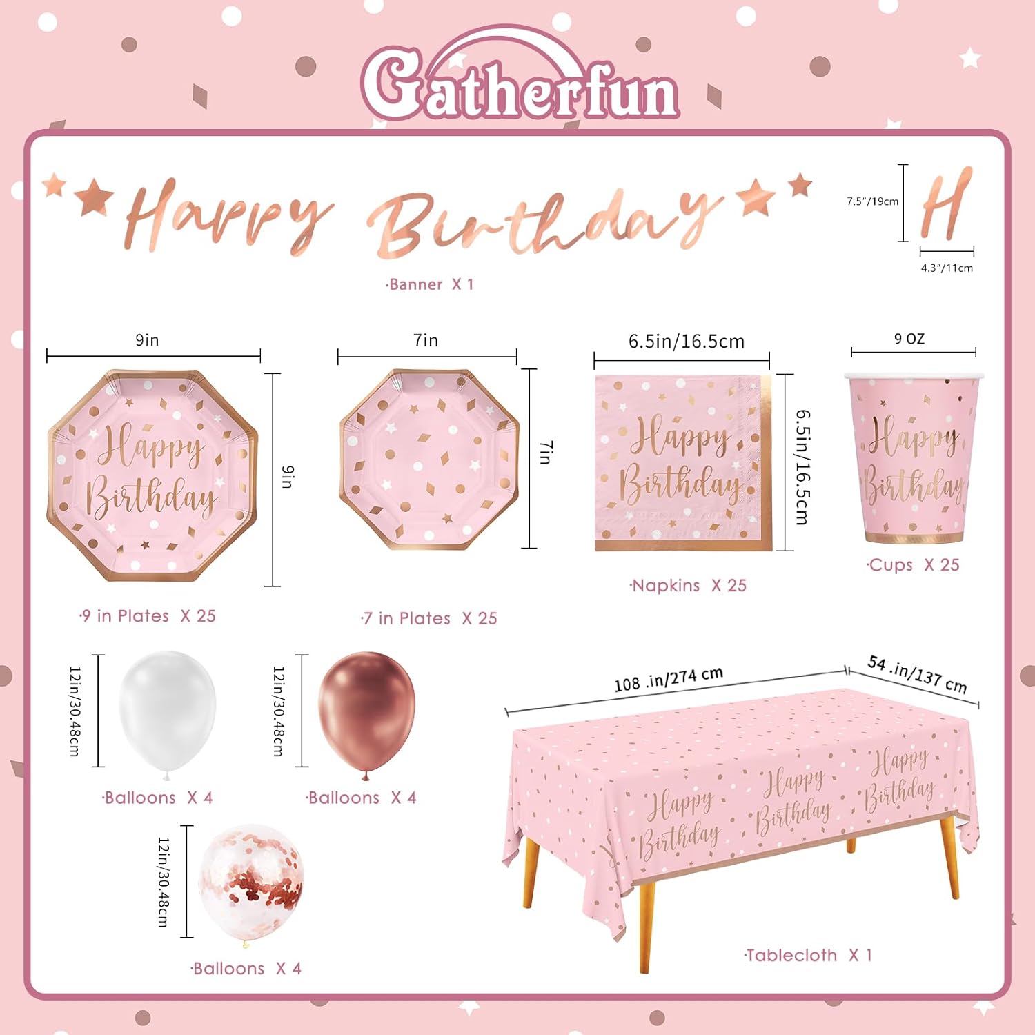 BIRTHDAY PACKAGE INCLUDING: 25*dinner paper plates (9 inches), 25*dessert paper plates (7inches), 25*napkins, 25*paper cups (9oz), 1*banner, 1*tablecloth (54*108inches),4*Rose Gold balloons,4*white balloons, 4* Rose Gold confetti latex balloons