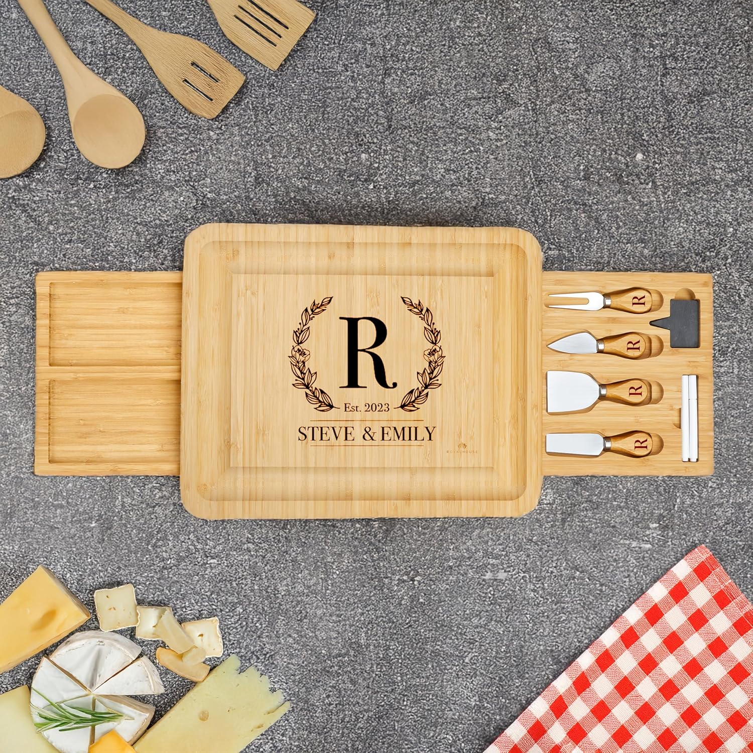 VERSATILE FOR ENTERTAINING & EVERYDAY USE: Designed for gatherings and casual dining alike, this charcuterie board is great for serving cheeses, meats, fruits, and more. It features a built-in groove for crackers and snacks, while the hidden drawer includes cheese knives, meat knives, and serving utensils. This personalized charcuterie board is the ultimate entertaining tool, making it a go-to for housewarming parties, engagement gifts for couples, and dinner events during the holidays