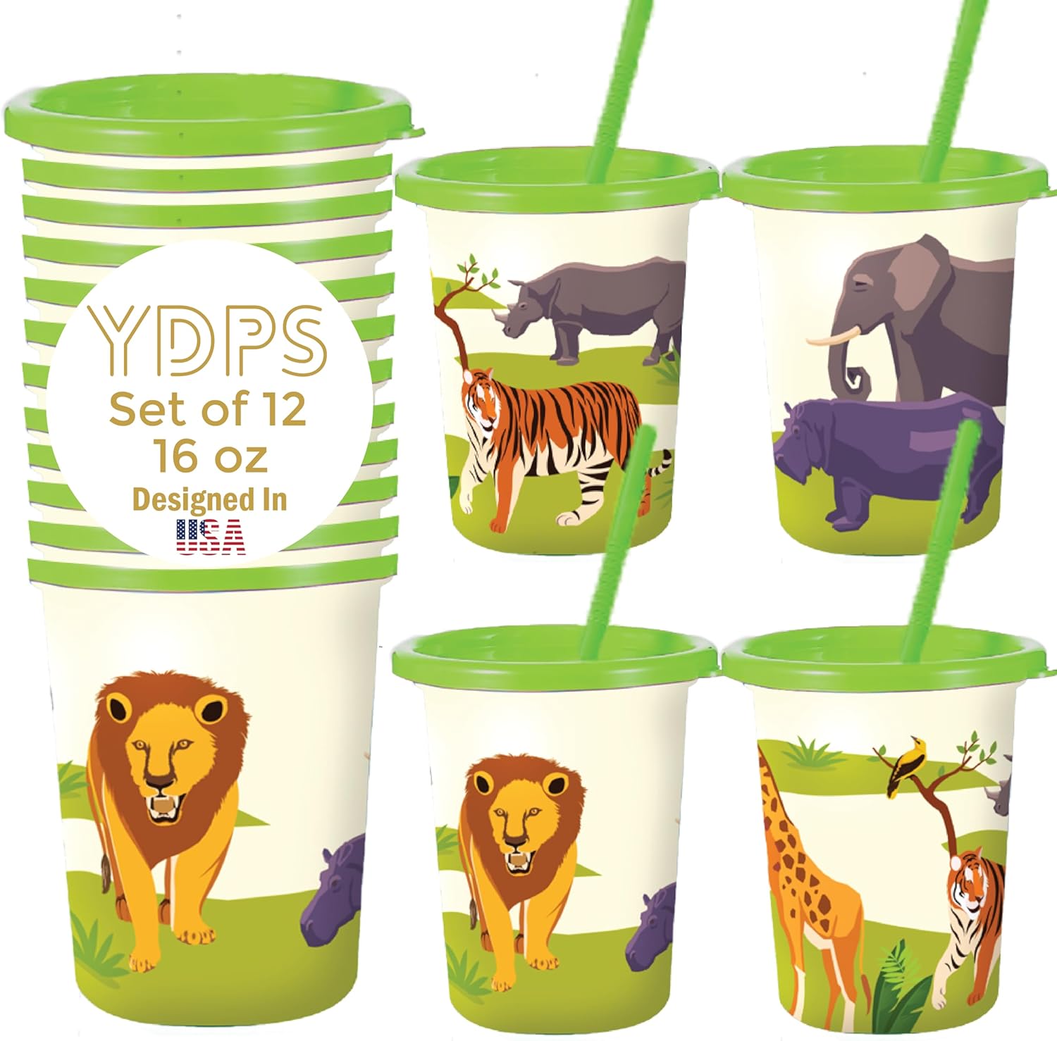Safari Party Decorations – Set of 12 Zoo Animal Cups with Lids and Straws, Perfect for Safari Birthday, Zoo Favors & Jungle Animal Party Theme