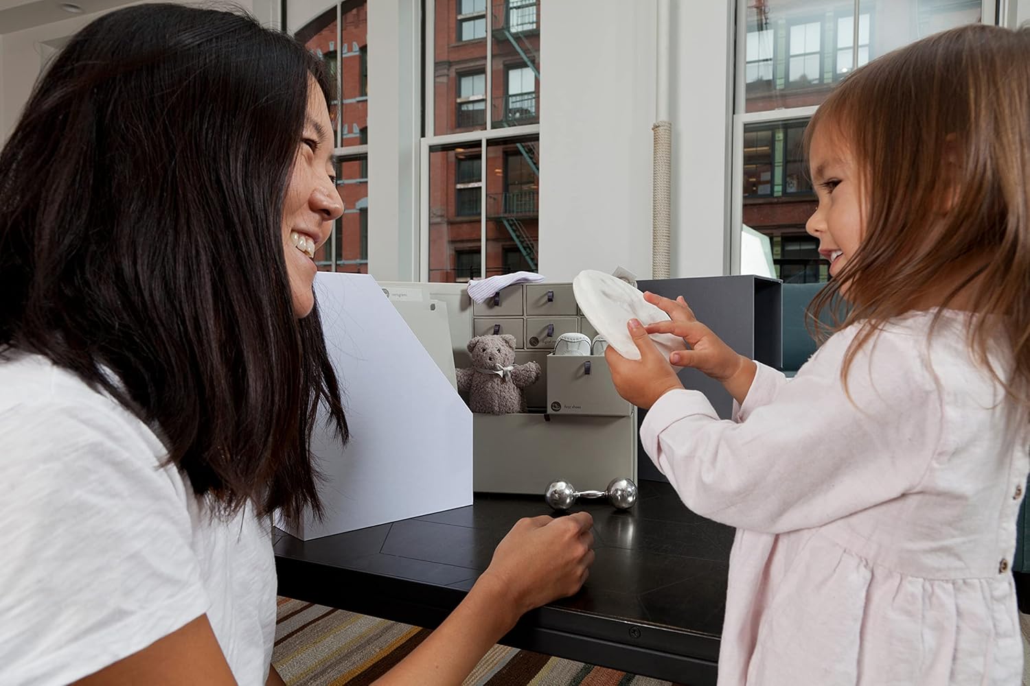 Everything you need to easily organize baby memories: All the most important baby keepsakes organized in one convenient home. 9 drawers in ‘Collections’ box makes sorting all your baby’s keepsakes – first baby shoes, heirloom rattle, favorite blankie and other keepsake objects – a snap.