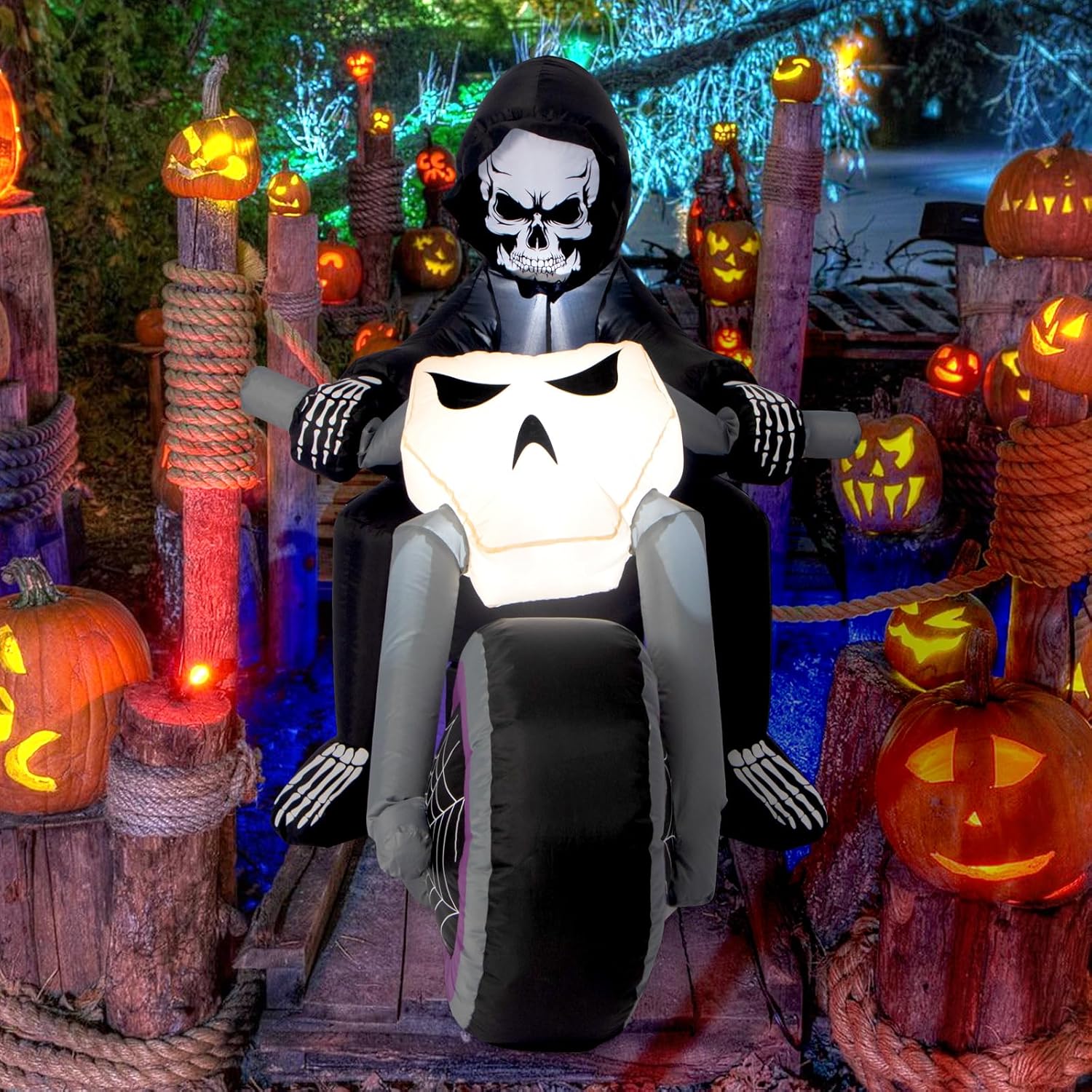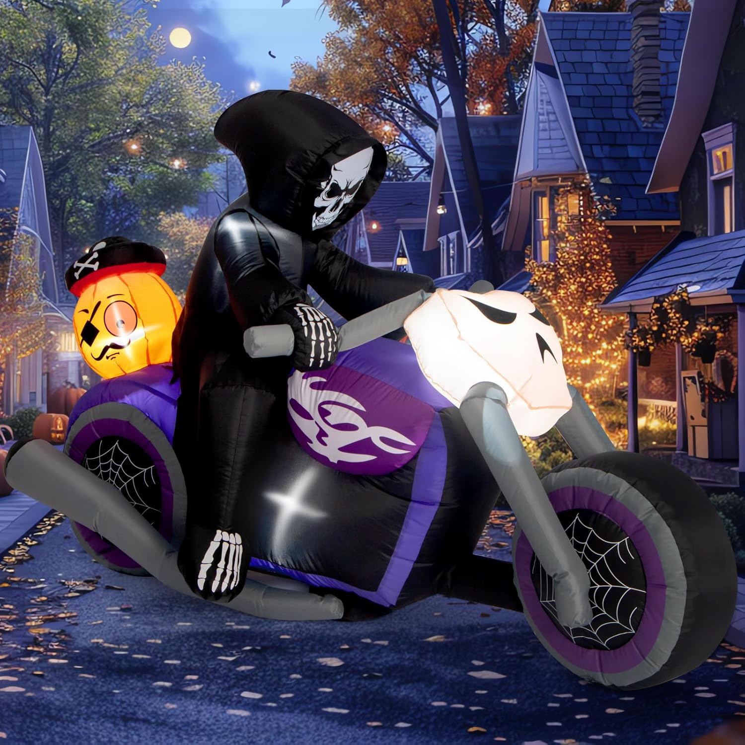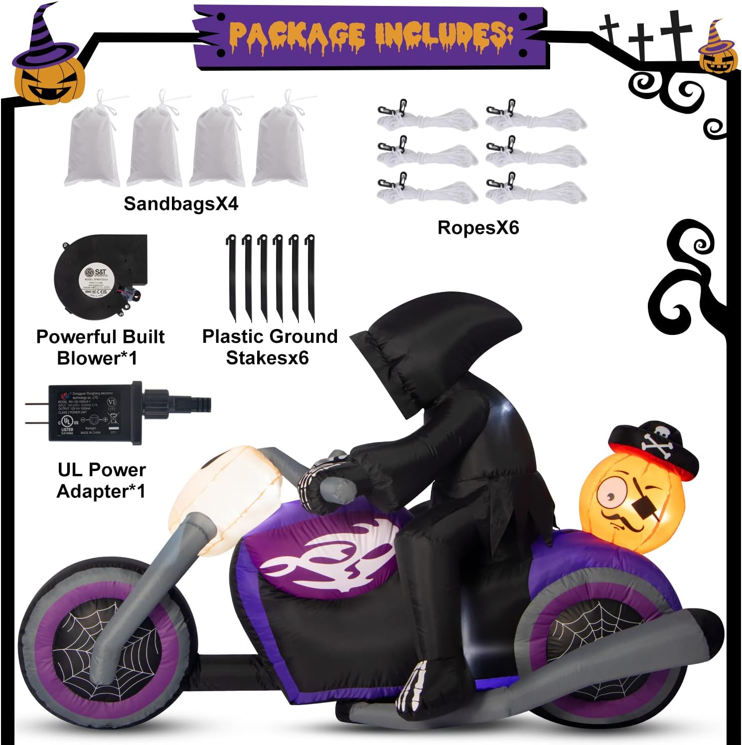 【Great for Festival】This 6FT inflatables rider pumpkin with Built-in LED Lights creates a creepy yet friendly scene on your front lawn or walkway. Kids and parents alike love to take photos with Halloween blow ups,which would give your guests and your family a fright and a delight.