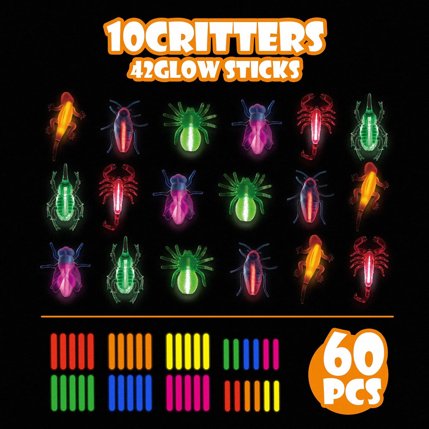 Glow in the Dark Halloween Critters Toys-There are 18pcs glow gritters in our glow in the dark party set ,6 different kinds,3pcs for each kind.42 glow sticks in 6 colors for the Critters.Also come with 18 bonus decoration strings.Easy to Active. Fun and safety. Glows for Hours.Replaceable Glow Sticks.