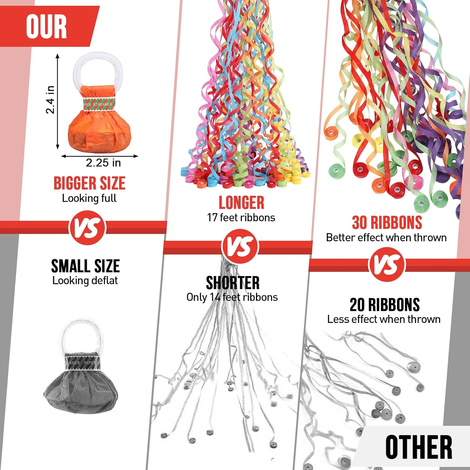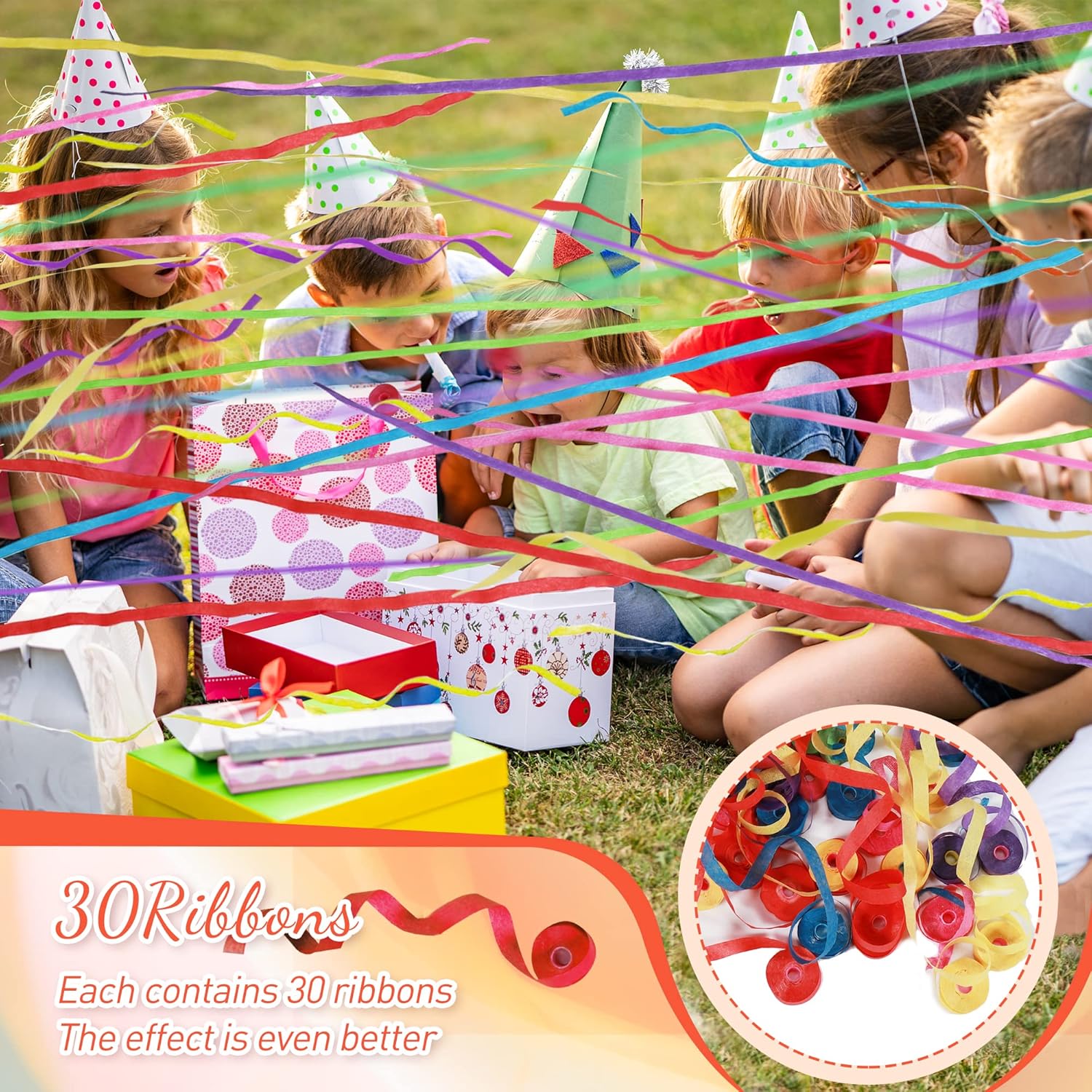 12 Pack/30 Ribbons/17 FT: Contains 12 Pack no each party poppers ribbons with a total of 30 thin ribbons, the length can reach 17 FT, invite guests to throw ribbons together! Add a big surprise to your party